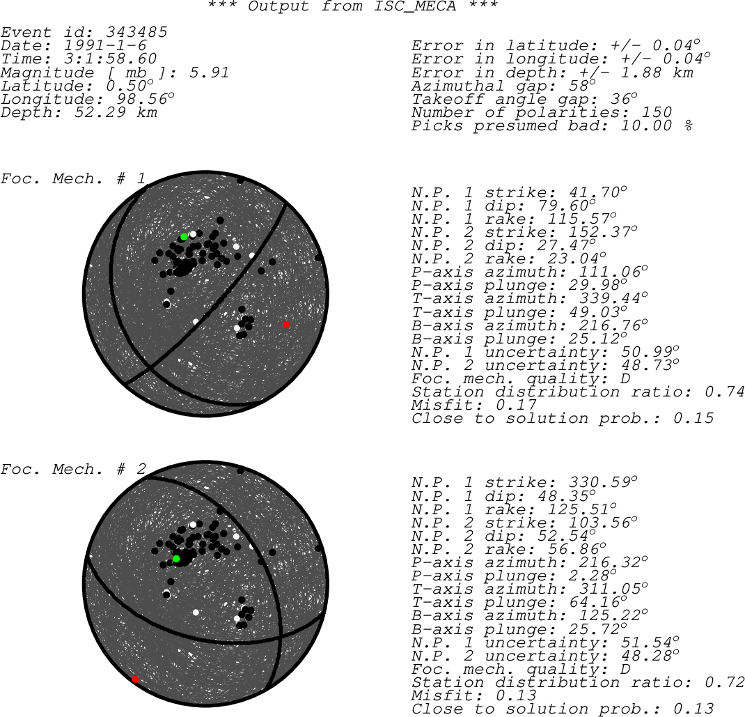Black dots -> compressions (C,c,+,U,u) White dots -> dilatations (D,d,-) Green dot -> T-axis Red dot -> P-axis