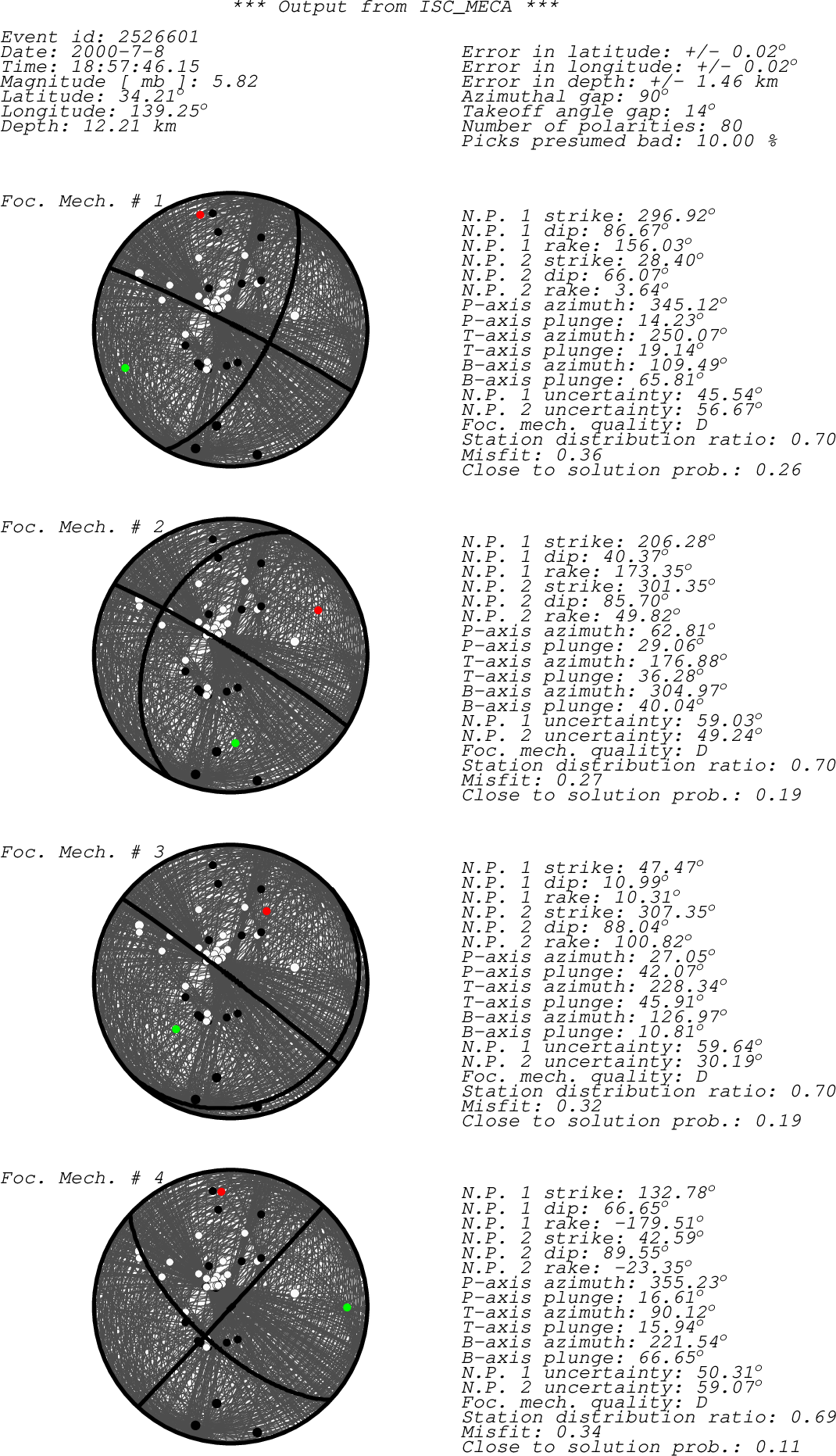 sta chan net loc pol a/m azi dist author irsta JKO ??? IR D 257.83 0.10 JMA JKO NJJJ ??? IR C 8.28 0.20 JMA NJJJ JMY ??? IR D 121.58 0.26 JMA JMY JIM2 ??? IR C 16.43 0.53 JMA JIM2 KTJJ ??? IR C 348.04 0.73 JMA KTJJ AJI ??? IR C 351.25 0.85 JMA AJI JSG ??? IR D 298.26 0.99 JMA JSG JOD2 ??? IR C 352.89 1.06 JMA JOD2 JYO ??? IR C 18.57 1.07 JMA JYO SHZ3 ??? IR D 315.31 1.21 JMA SHZ3 JYN ??? IR D 335.98 1.41 JMA JYN YSS ??? IR d 10.73 13.01 NEIC YSS SNY ??? IR d 306.24 14.49 BJI SNY DL2 ??? IR d 293.41 14.91 BJI DL2 SSE ??? IR U 263.46 15.53 BJI SSE NJ2 ??? IR C 268.51 17.22 BJI NJ2 TIA ??? IR C 282.62 18.19 BJI TIA QZH ??? IR C 248.25 20.17 BJI QZH SKR M?Z IR C 31.71 20.56 MOS SKR PET S?Z IR D 30.43 23.34 MOS PET GZH ??? IR c 250.76 25.22 BJI GZH TGY ??? IR c 224.08 25.99 MAN TGY MA2 ??? IR c 13.17 26.49 NEIC MA2 KALP ??? IR c 218.53 27.22 MAN KALP SCPH ??? IR d 210.64 27.39 MAN SCPH YAK B?Z IR D 350.55 28.50 MOS YAK BOD S?Z IR C 332.00 29.09 MOS BOD KCP ??? IR c 208.99 30.06 MAN KCP IRK M?Z IR D 316.51 30.81 MOS IRK KMI ??? IR d 263.88 32.85 BJI KMI PCI ??? IR d 211.57 39.40 NEIC PCI TRT ??? IR d 216.22 48.71 DJA TRT SVE ??? IR d 319.52 56.12 NEIC SVE ARU B?Z IR D 319.36 57.33 MOS ARU ASPA ??? IR c 185.80 57.78 NEIC ASPA APA S?Z IR D 335.86 64.54 MOS APA ARMA ??? IR c 168.24 65.33 NEIC ARMA DAG ??? IR D 354.65 68.42 DNK DAG MAK ??? IR c 308.10 68.81 NEIC MAK OBN B?Z IR D 323.19 69.30 MOS OBN PUL M?Z IR D 329.32 69.72 MOS PUL PYA ??? IR c 310.74 71.15 NEIC PYA ZEI S?Z IR D 309.27 71.22 MOS ZEI KIV ??? IR c 310.81 71.42 NEIC KIV CFR ??? IR - 317.83 79.37 BUC CFR VRI ??? IR - 319.00 79.72 BUC VRI ISR ??? IR - 318.50 80.29 BUC ISR MLR ??? IR + 319.06 80.38 BUC MLR SNX ??? IR - 319.15 80.70 BUC SNX CLL ??? IR + 329.31 82.64 CLL CLL VKA ??? IR D 325.63 83.38 VIE VKA MOX ??? IR + 329.52 83.72 JEN MOX MOX S?? IR C 329.52 83.72 JEN MOX BEO ??? IR + 321.12 83.74 BEO BEO ARSA ??? IR D 325.30 84.48 VIE ARSA MOA ??? IR D 326.34 84.63 VIE MOA OBKA ??? IR D 325.28 85.48 VIE OBKA FUR ??? IR d 328.05 85.74 NEIC FUR PTCC ??? IR D 325.82 86.11 ROM PTCC WTTA ??? IR d 327.27 86.26 NEIC WTTA MOTA ??? IR C 327.60 86.44 VIE MOTA SQTA ??? IR D 327.46 86.48 VIE SQTA DAVA ??? IR D 328.20 87.02 VIE DAVA KAMOR ??? IR D 328.40 87.19 ZUR KAMOR SLE ??? IR D 329.23 87.25 ZUR SLE WILA ??? IR D 328.79 87.34 ZUR WILA OSS ??? IR D 327.67 87.36 ZUR OSS DAVOS ??? IR D 327.95 87.40 ZUR DAVOS DAVON ??? IR D 327.95 87.40 ZUR DAVON MELS ??? IR D 328.31 87.42 ZUR MELS DMUB ??? IR d 340.74 87.49 DIAS DMUB ZLA ??? IR D 329.10 87.51 ZUR ZLA BERNI ??? IR D 327.56 87.63 ZUR BERNI LLS ??? IR D 328.38 87.74 ZUR LLS VDL ??? IR D 327.91 87.83 ZUR VDL BNALP ??? IR D 328.70 87.97 ZUR BNALP SAL ??? IR C 326.77 88.02 ROM SAL BOURR ??? IR D 329.67 88.07 ZUR BOURR HASLI ??? IR D 328.78 88.18 ZUR HASLI TMA ??? IR c 327.98 88.37 NEIC TMA VAI ??? IR C 327.88 88.60 ROM VAI SIERE ??? IR D 328.91 88.76 ZUR SIERE MMK ??? IR c 328.44 88.81 NEIC MMK MCGN ??? IR C 328.37 88.87 ROM MCGN DIX ??? IR c 328.76 89.03 NEIC DIX AQU ??? IR C 323.06 89.09 ROM AQU sta - Station code (FDSN) chan - channel code net - Network code (FDSN) loc - Location code (FDSN) pol - Polarity a/m - Automatic or manual pick azi - Event to station azimuth (in degrees) dist - Event to station distance (in degrees) author - Author of the polarity irsta - International registry station code