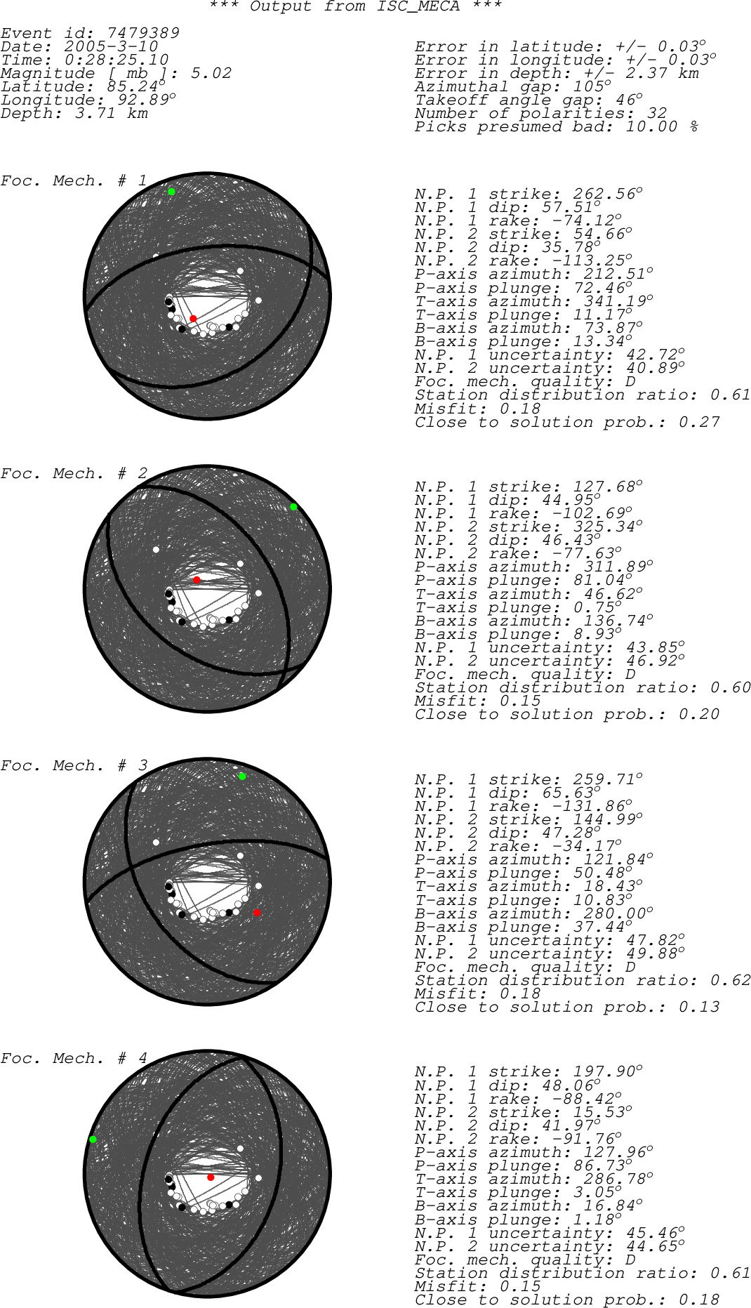 sta chan net loc pol a/m azi dist author irsta DAG S?Z IR D 307.71 15.71 MOS DAG DAG ??? IR d 307.71 15.71 NEIC DAG DAG ??? IR D 307.71 15.71 DNK DAG LVZ B?Z IR C 249.37 20.11 MOS LVZ APA M?Z IR C 250.51 20.53 MOS APA BILL B?Z IR D 94.72 21.20 MOS BILL YAK B?Z IR D 136.97 24.44 MOS YAK SOKR S?Z IR D 221.60 26.83 MOS SOKR COLA B?Z IR D 52.72 27.91 MOS COLA MA2 B?Z IR D 114.64 28.31 MOS MA2 SVE S?Z IR C 216.71 29.39 MOS SVE OBN B?Z IR D 242.48 32.62 MOS OBN CLL S?Z IR D 265.86 38.28 MOS CLL CLL ??? IR d 265.86 38.28 NEIC CLL CLL ??? IR - 265.86 38.28 CLL CLL VRAC S?Z IR C 261.83 39.97 MOS VRAC YSS B?Z IR D 125.90 40.28 MOS YSS PSZ ??? IR d 258.22 41.08 BUD PSZ WMQ ??? IR D 185.67 41.60 BJI WMQ MOA ??? IR D 263.90 41.61 VIE MOA ARSA ??? IR C 262.52 42.10 VIE ARSA GOF S?Z IR D 233.80 42.17 MOS GOF CN2 ??? IR C 144.71 42.41 BJI CN2 KBA ??? IR D 264.68 42.45 VIE KBA KBA S?Z IR D 264.68 42.45 MOS KBA DAVA ??? IR D 268.19 42.54 VIE DAVA OBKA ??? IR D 263.37 42.92 VIE OBKA MLR S?Z IR C 251.62 43.00 MOS MLR AAK S?Z IR D 199.96 43.02 MOS AAK CFR S?Z IR C 249.32 43.14 MOS CFR BZS S?Z IR D 256.06 43.23 MOS BZS BOLS ??? IR - 255.43 44.97 BEO BOLS GTA ??? IR D 172.54 46.02 BJI GTA GNI B?Z IR D 231.39 46.94 MOS GNI TIA ??? IR D 154.17 49.63 BJI TIA GYA ??? IR D 165.59 59.04 BJI GYA KMI ??? IR D 169.72 60.30 BJI KMI KMI S?Z IR D 169.72 60.30 MOS KMI KMI ??? IR d 169.72 60.30 NEIC KMI CHRT ??? IR d 172.87 65.49 BKK CHRT CHG ??? IR d 173.75 66.54 BKK CHG sta - Station code (FDSN) chan - channel code net - Network code (FDSN) loc - Location code (FDSN) pol - Polarity a/m - Automatic or manual pick azi - Event to station azimuth (in degrees) dist - Event to station distance (in degrees) author - Author of the polarity irsta - International registry station code