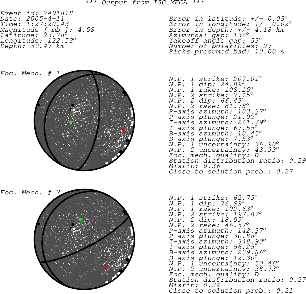 Black dots -> compressions (C,c,+,U,u) White dots -> dilatations (D,d,-) Green dot -> T-axis Red dot -> P-axis