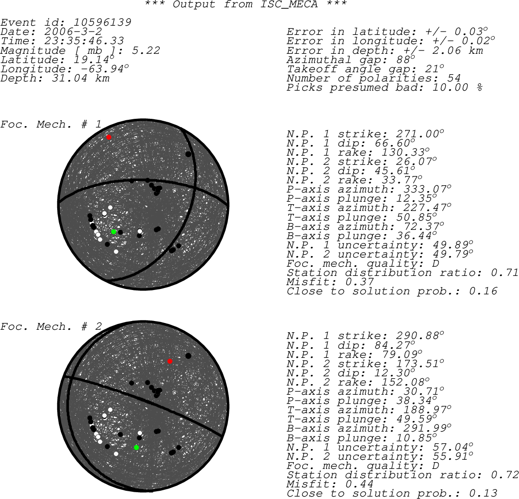 sta chan net loc pol a/m azi dist author irsta ABV ??? IR C 222.01 0.55 TRN ABV TBVI SHZ IR U 221.62 0.96 RSPR TBVI STVI ??? IR D 230.78 1.24 TRN STVI STMA ??? IR D 144.06 1.35 TRN STMA CDVI ??? IR D 209.62 1.59 TRN CDVI MTP ??? IR D 236.00 1.85 TRN MTP CBYP ??? IR C 244.78 2.01 TRN CBYP CPD ??? IR D 239.86 2.17 TRN CPD SJG SHZ IR D 244.25 2.33 RSPR SJG SJG ??? IR C 244.25 2.33 TRN SJG CELP SHZ IR U 247.41 2.72 RSPR CELP OBIP ??? IR C 247.01 2.75 TRN OBIP AOPR ??? IR C 253.89 2.78 TRN AOPR AOPR ??? IR c 253.89 2.78 NEIC AOPR LRS SHZ IR U 253.35 2.88 RSPR LRS AGPR ??? IR C 257.89 3.08 TRN AGPR LSP ??? IR D 252.61 3.13 TRN LSP MPR ??? IR C 253.52 3.17 TRN MPR MGP SHZ IR D 249.78 3.19 RSPR MGP CRPR ??? IR C 249.89 3.21 TRN CRPR SEG ??? IR C 139.20 3.58 TRN SEG BBL ??? IR C 146.35 4.30 TRN BBL FDF ??? IR C 148.24 5.13 TRN FDF BIM ??? IR C 148.71 5.36 TRN BIM CONN S?Z IR D 253.31 22.21 CASC CONN COPN S?Z IR C 255.70 22.87 CASC COPN MIRN S?Z IR C 256.43 22.89 CASC MIRN TEL3 S?Z IR D 256.86 22.97 CASC TEL3 OTAV ??? IR c 218.79 23.57 NEIC OTAV TP2 S?Z IR D 264.68 26.25 CASC TP2 LPAZ ??? IR c 186.95 35.45 NEIC LPAZ LPAZ S?Z IR C 186.95 35.45 MOS LPAZ CAM3 ??? IR C 148.73 45.79 VAO CAM3 CAM4 ??? IR C 152.15 46.24 VAO CAM4 PEL B?Z IR D 187.14 52.39 GUC PEL FCH B?Z IR C 186.70 52.53 GUC FCH CLCH B?Z IR C 186.94 52.62 GUC CLCH CACH S?Z IR C 186.89 53.34 GUC CACH YKA S?Z IR C 334.15 55.46 MOS YKA DAG ??? IR C 10.69 61.94 DNK DAG DAG S?Z IR C 10.69 61.94 MOS DAG DAVA ??? IR d 46.03 65.29 VIE DAVA MOTA EHZ IR c 45.93 66.11 VIE MOTA SQTA EHZ IR d 46.07 66.19 VIE SQTA WATA ??? IR c 45.93 66.44 VIE WATA OBKA HHZ IR d 46.66 68.53 VIE OBKA VRAC ??? IR c 43.53 69.62 NEIC VRAC PSZ ??? IR c 44.69 71.97 BUD PSZ BZS ??? IR C 46.86 73.53 BUC BZS APA S?Z IR C 23.18 75.25 MOS APA VOIR ??? IR D 46.53 75.92 BUC VOIR MLR ??? IR C 46.33 76.53 BUC MLR VRI ??? IR C 45.82 76.97 BUC VRI ISR ??? IR D 46.60 77.02 BUC ISR HARR ??? IR C 46.77 78.09 BUC HARR CFR ??? IR D 46.25 78.10 BUC CFR TIRR ??? IR C 46.91 78.48 BUC TIRR OBN S?Z IR C 34.96 80.34 MOS OBN BRTR S?Z IR C 50.29 83.61 MOS BRTR MALT S?Z IR C 50.27 87.60 MOS MALT GNI B?Z IR D 46.58 91.30 MOS GNI MAK M?Z IR D 43.13 91.86 MOS MAK sta - Station code (FDSN) chan - channel code net - Network code (FDSN) loc - Location code (FDSN) pol - Polarity a/m - Automatic or manual pick azi - Event to station azimuth (in degrees) dist - Event to station distance (in degrees) author - Author of the polarity irsta - International registry station code