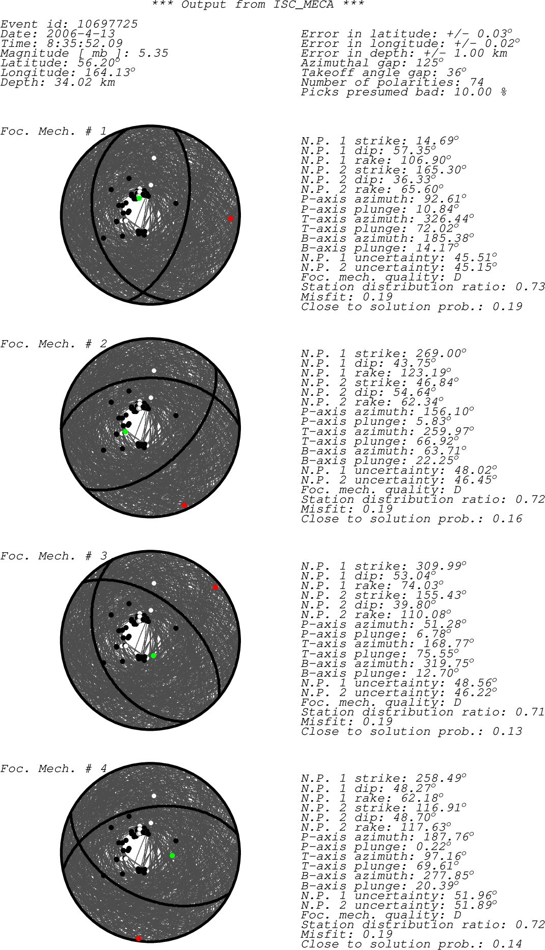 sta chan net loc pol a/m azi dist author irsta BILL B?Z IR D 3.90 11.92 MOS BILL YSS S?Z IR C 243.99 16.13 MOS YSS YAK B?Z IR C 302.59 18.45 MOS YAK TIXI ??? IR c 329.91 21.39 NEIC TIXI MAJO S?Z IR C 232.59 26.31 MOS MAJO MAJO ??? IR c 232.59 26.31 NEIC MAJO CN2 ??? IR C 259.58 27.40 BJI CN2 SNY ??? IR C 258.42 29.74 BJI SNY ZAK S?Z IR C 286.98 35.78 MOS ZAK DAG ??? IR D 0.87 47.28 DNK DAG DAG S?Z IR D 0.87 47.28 MOS DAG WMQ ??? IR C 289.19 48.16 BJI WMQ GYA ??? IR D 258.62 50.44 BJI GYA APA S?Z IR D 338.11 51.26 MOS APA IMW ??? IR c 65.17 52.51 NEIC IMW ARU S?Z IR C 317.71 52.69 MOS ARU KLMR B?Z IR C 330.70 55.41 MOS KLMR AAK ??? IR c 296.83 55.79 NEIC AAK LSA S?Z IR C 274.42 56.56 MOS LSA LSA ??? IR c 274.42 56.56 NEIC LSA ORR S?Z IR C 315.98 57.81 MOS ORR NANT ??? IR c 258.50 59.84 BKK NANT MOS S?Z IR D 328.43 60.27 MOS MOS VSU B?Z IR D 335.92 60.71 MOS VSU OBN B?Z IR C 328.66 61.12 MOS OBN NST ??? IR d 256.98 62.70 BKK NST KONO S?Z IR C 345.78 62.73 MOS KONO GOF S?Z IR C 318.98 67.64 MOS GOF KIV S?Z IR C 318.60 68.71 MOS KIV CLZ ??Z IR - 343.05 70.16 BGR CLZ CLL ??Z IR + 341.21 70.22 CLL CLL CLL S?Z IR C 341.21 70.22 MOS CLL GNI B?Z IR C 315.13 71.19 MOS GNI CFR S?Z IR D 328.98 72.43 MOS CFR MLR S?Z IR D 330.59 72.76 MOS MLR BAIF ??? IR C 346.61 72.80 LDG BAIF BAIF S?Z IR C 346.61 72.80 MOS BAIF BAIF ??? IR c 346.61 72.80 NEIC BAIF TIRR S?Z IR D 328.48 73.00 MOS TIRR VOIR S?Z IR D 331.18 73.05 MOS VOIR HYB ??? IR c 276.31 73.27 HYB HYB HYB S?Z IR C 276.31 73.27 MOS HYB HYB ??? IR c 276.31 73.27 NEIC HYB MOA HHZ IR c 339.33 73.30 VIE MOA KAKA ??? IR C 212.31 73.58 AUST KAKA ARSA HHZ IR c 338.29 73.62 VIE ARSA BZS ??? IR c 333.59 73.77 NEIC BZS CDF ??? IR C 344.19 73.98 LDG CDF CDF S?Z IR C 344.19 73.98 MOS CDF CDF ??? IR c 344.19 73.98 NEIC CDF WATA EHZ IR d 341.00 74.30 VIE WATA WTTA HHZ IR c 340.94 74.36 VIE WTTA SQTA EHZ IR d 341.21 74.48 VIE SQTA HAU ??? IR C 344.72 74.51 LDG HAU HAU S?Z IR C 344.72 74.51 MOS HAU HAU ??? IR c 344.72 74.51 NEIC HAU OBKA HHZ IR c 338.73 74.52 VIE OBKA FLN ??? IR C 349.51 74.62 LDG FLN FLN S?Z IR C 349.51 74.62 MOS FLN FLN ??? IR c 349.51 74.62 NEIC FLN DAVA HHZ IR c 342.14 74.65 VIE DAVA LDF ??? IR C 349.24 74.75 LDG LDF LDF S?Z IR C 349.24 74.75 MOS LDF LDF ??? IR c 349.24 74.75 NEIC LDF POO S?? IR C 280.77 74.97 NDI POO GRR ??? IR C 349.71 75.03 LDG GRR GRR S?Z IR C 349.71 75.03 MOS GRR GRR ??? IR c 349.71 75.03 NEIC GRR MALT ??? IR c 318.65 75.20 NEIC MALT ROSF ??? IR C 351.35 75.30 LDG ROSF ROSF S?Z IR C 351.35 75.30 MOS ROSF ROSF ??? IR c 351.35 75.30 NEIC ROSF LOR ??? IR C 346.27 75.58 LDG LOR LOR S?Z IR C 346.27 75.58 MOS LOR LOR ??? IR c 346.27 75.58 NEIC LOR AVF ??? IR C 346.52 76.12 LDG AVF AVF S?Z IR C 346.52 76.12 MOS AVF AVF ??? IR c 346.52 76.12 NEIC AVF MFF ??? IR C 348.93 76.72 LDG MFF MFF S?Z IR C 348.93 76.72 MOS MFF MFF ??? IR c 348.93 76.72 NEIC MFF TCF ??? IR C 347.23 76.76 LDG TCF TCF S?Z IR C 347.23 76.76 MOS TCF TCF ??? IR c 347.23 76.76 NEIC TCF LPL ??? IR C 343.89 76.88 LDG LPL LPL S?Z IR C 343.89 76.88 MOS LPL LPL ??? IR c 343.89 76.88 NEIC LPL LPG ??? IR C 343.87 76.90 LDG LPG LPG S?Z IR C 343.87 76.90 MOS LPG LPG ??? IR c 343.87 76.90 NEIC LPG CTA ??? IR C 197.19 77.48 AUST CTA ORIF ??? IR C 344.36 77.60 LDG ORIF ORIF S?Z IR C 344.36 77.60 MOS ORIF ORIF ??? IR c 344.36 77.60 NEIC ORIF MBDF ??? IR C 343.69 77.65 LDG MBDF MBDF S?Z IR C 343.69 77.65 MOS MBDF MBDF ??? IR c 343.69 77.65 NEIC MBDF VIVF ??? IR C 345.21 77.84 LDG VIVF VIVF S?Z IR C 345.21 77.84 MOS VIVF VIVF ??? IR c 345.21 77.84 NEIC VIVF CAF ??? IR C 347.08 78.12 LDG CAF CAF S?Z IR C 347.08 78.12 MOS CAF CAF ??? IR c 347.08 78.12 NEIC CAF LFF ??? IR C 348.03 78.26 LDG LFF LFF S?Z IR C 348.03 78.26 MOS LFF LFF ??? IR c 348.03 78.26 NEIC LFF SBF ??? IR C 343.01 78.38 LDG SBF SBF S?Z IR C 343.01 78.38 MOS SBF SBF ??? IR c 343.01 78.38 NEIC SBF MTLF ??? IR C 346.69 79.66 LDG MTLF MTLF S?Z IR C 346.69 79.66 MOS MTLF MTLF ??? IR c 346.69 79.66 NEIC MTLF WB2 ??? IR C 208.33 79.91 AUST WB2 ETSF ??? IR C 348.65 80.42 LDG ETSF ETSF S?Z IR C 348.65 80.42 MOS ETSF ETSF ??? IR c 348.65 80.42 NEIC ETSF FITZ ??? IR C 216.85 80.79 AUST FITZ AS31 ??? IR c 207.68 83.58 NEIC AS31 ASPA ??? IR C 207.68 83.58 AUST ASPA EVO ??? IR C 353.83 85.40 LDG EVO ARMA ??? IR D 190.79 86.93 AUST ARMA STKA ??? IR C 199.03 89.81 AUST STKA sta - Station code (FDSN) chan - channel code net - Network code (FDSN) loc - Location code (FDSN) pol - Polarity a/m - Automatic or manual pick azi - Event to station azimuth (in degrees) dist - Event to station distance (in degrees) author - Author of the polarity irsta - International registry station code