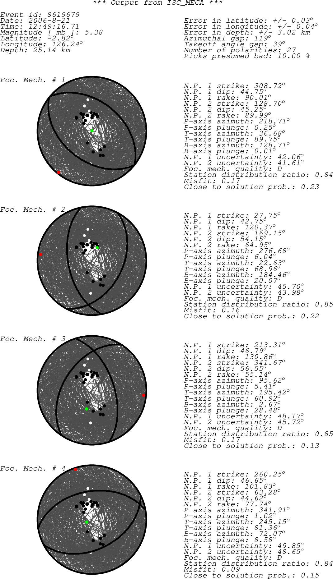 sta chan net loc pol a/m azi dist author irsta FITZ ??? IR d 182.19 15.20 NEIC FITZ PVCP ??? IR d 352.80 16.44 MAN PVCP BJII ??? IR C 254.14 17.07 DJA BJII BJII ??? IR C 254.14 17.07 DJA BJII WB2 ??? IR c 155.65 18.77 NEIC WB2 BCPH ??? IR d 343.83 19.88 MAN BCPH AS31 ??? IR c 160.96 22.01 NEIC AS31 FORT ??? IR c 176.66 27.86 NEIC FORT STKA ??? IR c 155.08 32.32 NEIC STKA NANT ??? IR c 311.52 33.06 BKK NANT SSE ??? IR D 352.24 34.07 BJI SSE CHG ??? IR c 309.75 34.40 BKK CHG GYA ??? IR C 328.17 34.72 BJI GYA ARMA ??? IR c 141.47 36.48 NEIC ARMA CD2 ??? IR C 329.10 39.80 BJI CD2 LZH ??? IR C 333.62 44.00 BJI LZH SNY ??? IR C 357.16 44.50 BJI SNY YSS S?Z IR C 14.37 51.65 MOS YSS HABR S?Z IR C 7.46 51.66 MOS HABR ZAK S?Z IR C 342.58 56.55 MOS ZAK WMQ ??? IR C 327.82 57.88 BJI WMQ IRK S?Z IR C 344.25 57.92 MOS IRK PET M?Z IR C 21.52 61.94 MOS PET YAK B?Z IR C 1.79 64.72 MOS YAK TIXI ??? IR c 0.86 74.35 NEIC TIXI BILL S?Z IR D 14.44 75.97 MOS BILL MAW ??? IR c 200.54 77.49 NEIC MAW ARU S?Z IR C 328.56 80.20 MOS ARU KIV B?Z IR C 314.07 87.30 MOS KIV OBN B?Z IR C 324.91 92.10 MOS OBN sta - Station code (FDSN) chan - channel code net - Network code (FDSN) loc - Location code (FDSN) pol - Polarity a/m - Automatic or manual pick azi - Event to station azimuth (in degrees) dist - Event to station distance (in degrees) author - Author of the polarity irsta - International registry station code