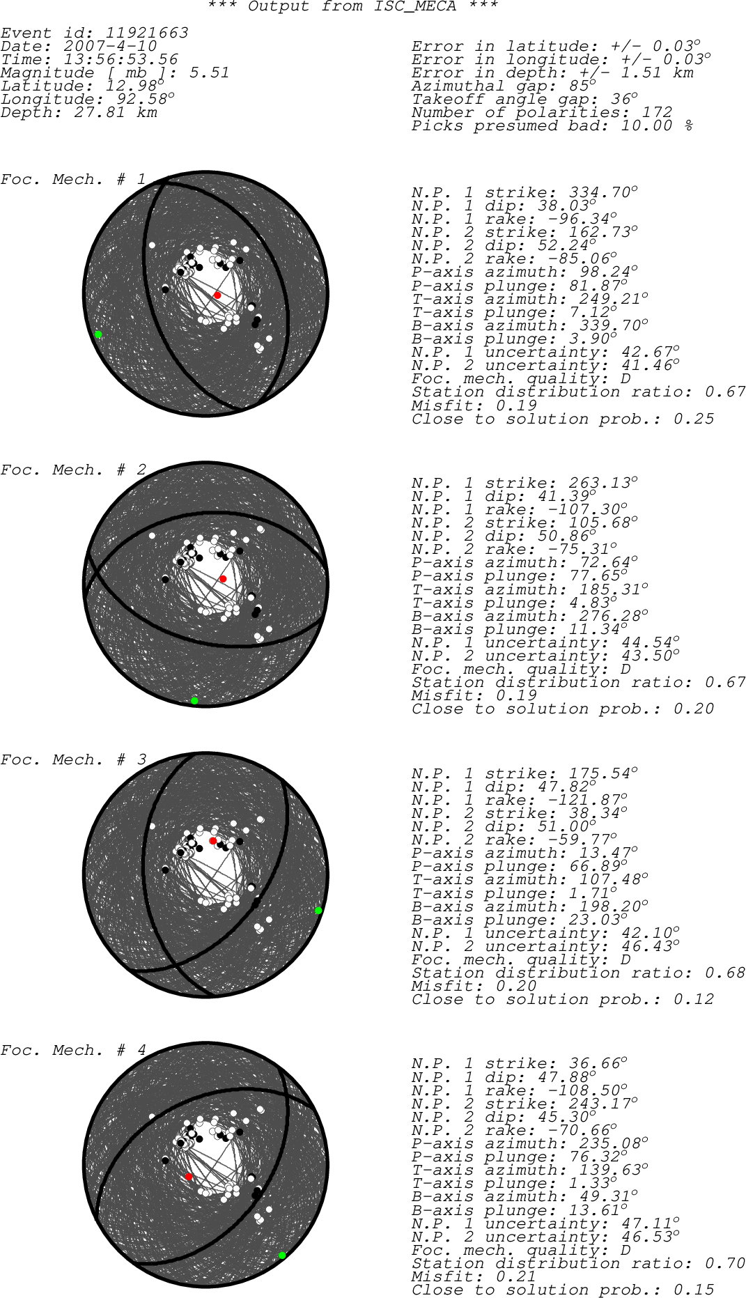 Black dots -> compressions (C,c,+,U,u) White dots -> dilatations (D,d,-) Green dot -> T-axis Red dot -> P-axis