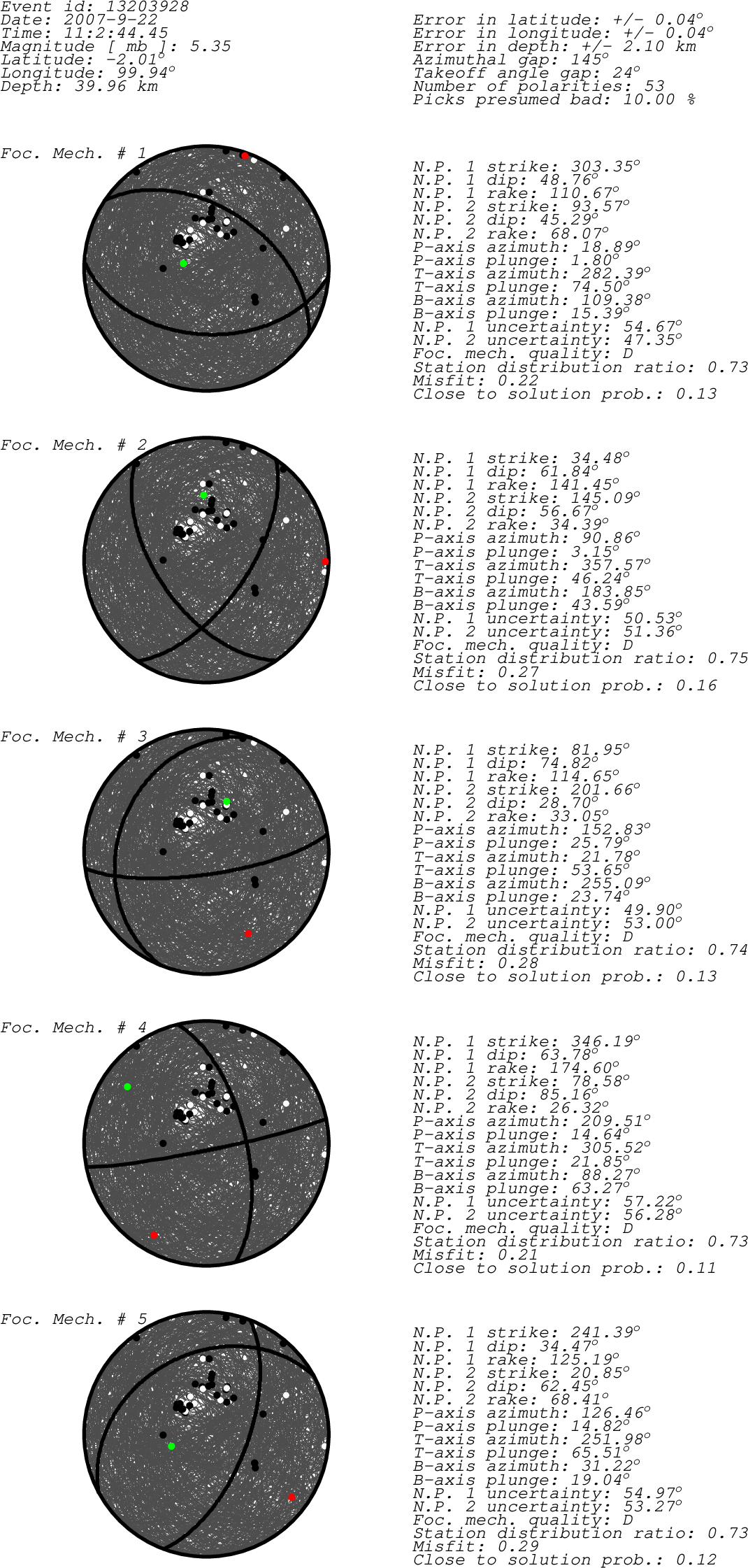 Black dots -> compressions (C,c,+,U,u) White dots -> dilatations (D,d,-) Green dot -> T-axis Red dot -> P-axis