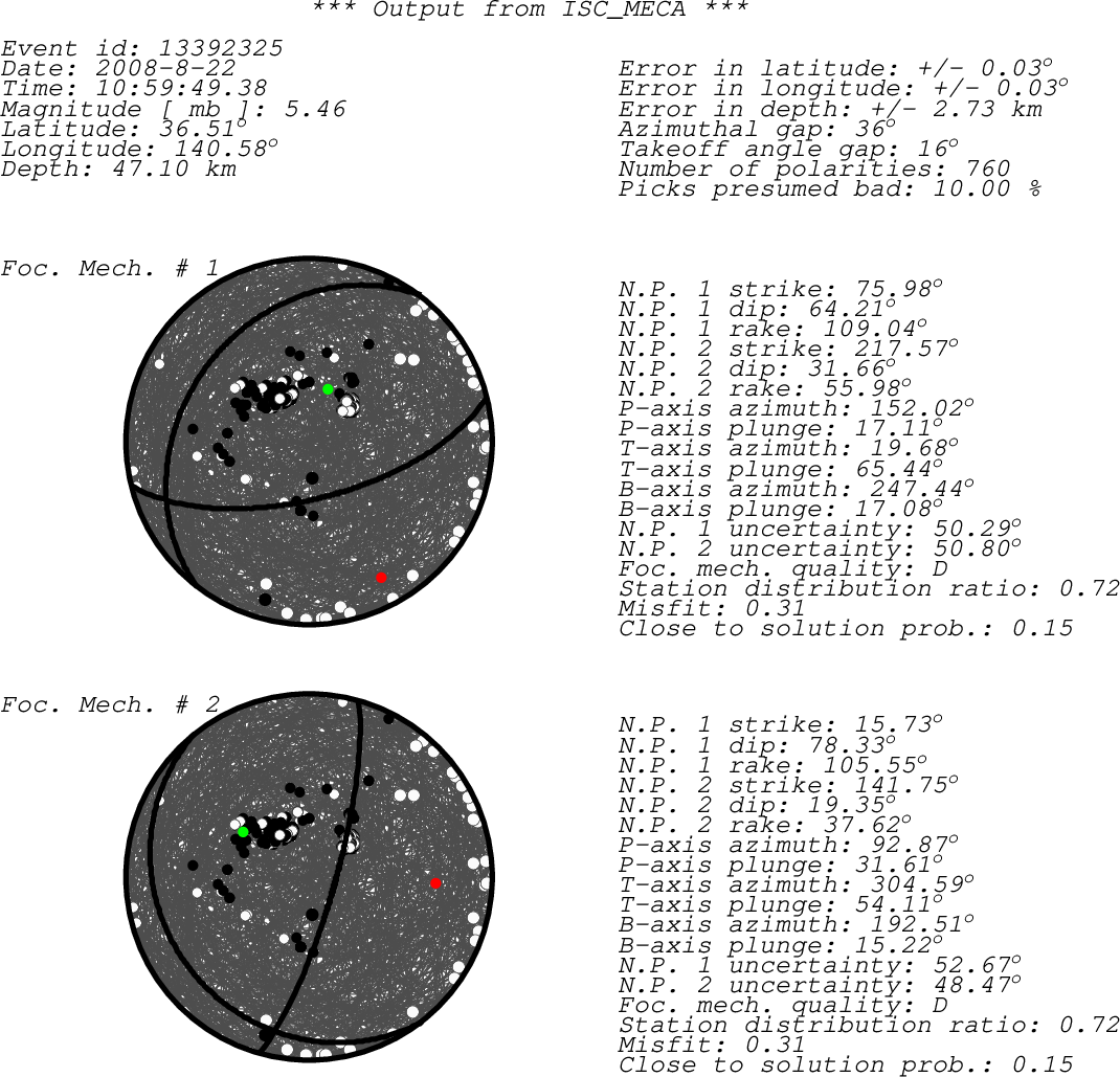 Black dots -> compressions (C,c,+,U,u) White dots -> dilatations (D,d,-) Green dot -> T-axis Red dot -> P-axis