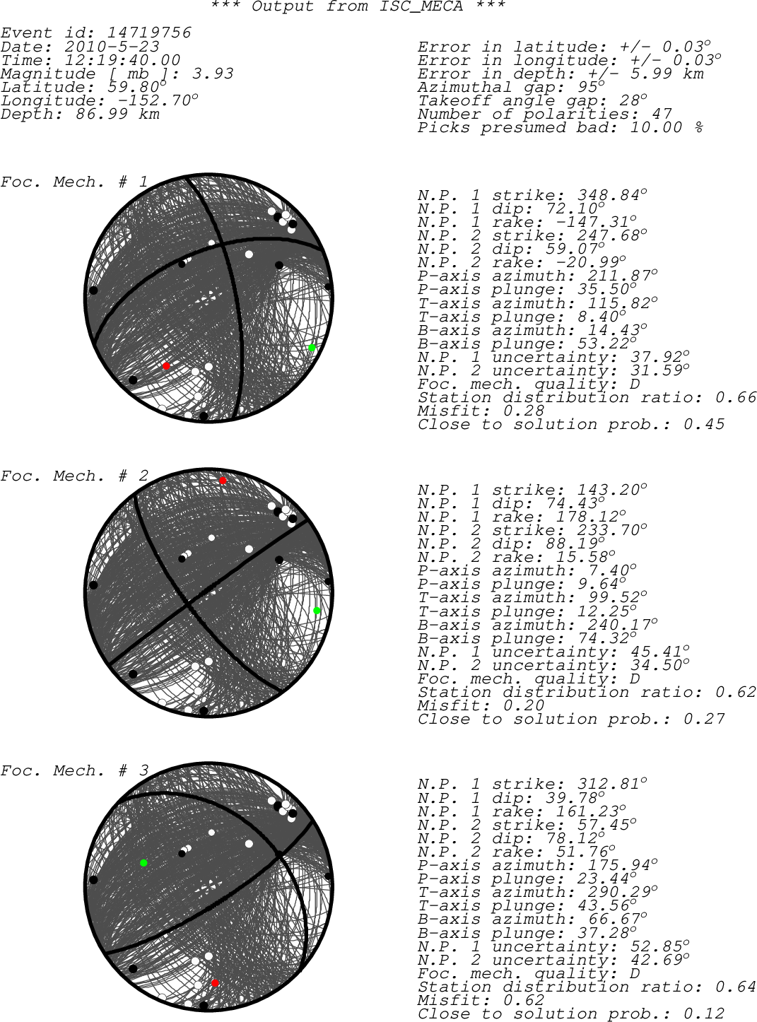 Black dots -> compressions (C,c,+,U,u) White dots -> dilatations (D,d,-) Green dot -> T-axis Red dot -> P-axis