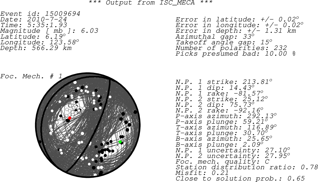 Black dots -> compressions (C,c,+,U,u) White dots -> dilatations (D,d,-) Green dot -> T-axis Red dot -> P-axis
