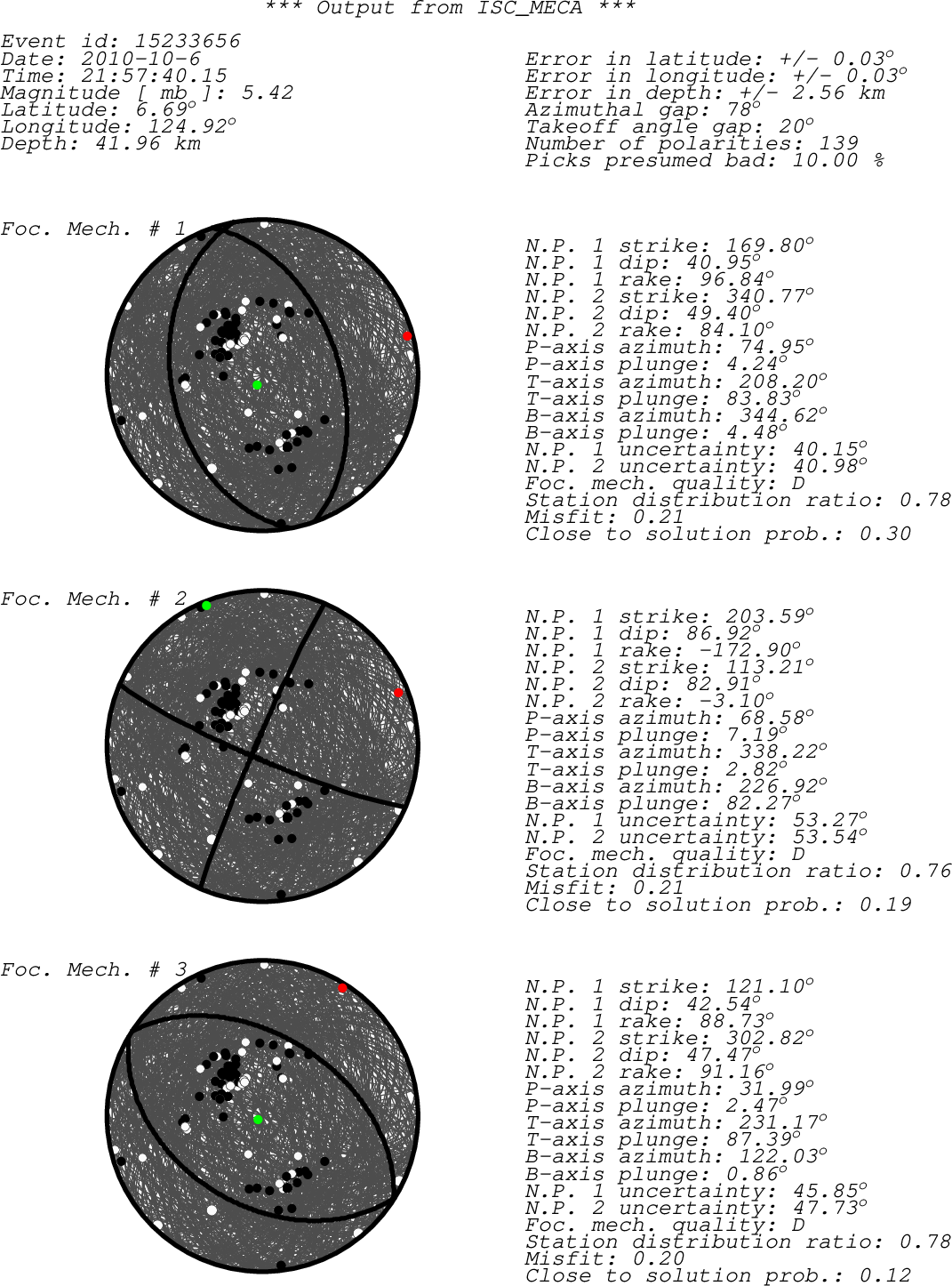 Black dots -> compressions (C,c,+,U,u) White dots -> dilatations (D,d,-) Green dot -> T-axis Red dot -> P-axis