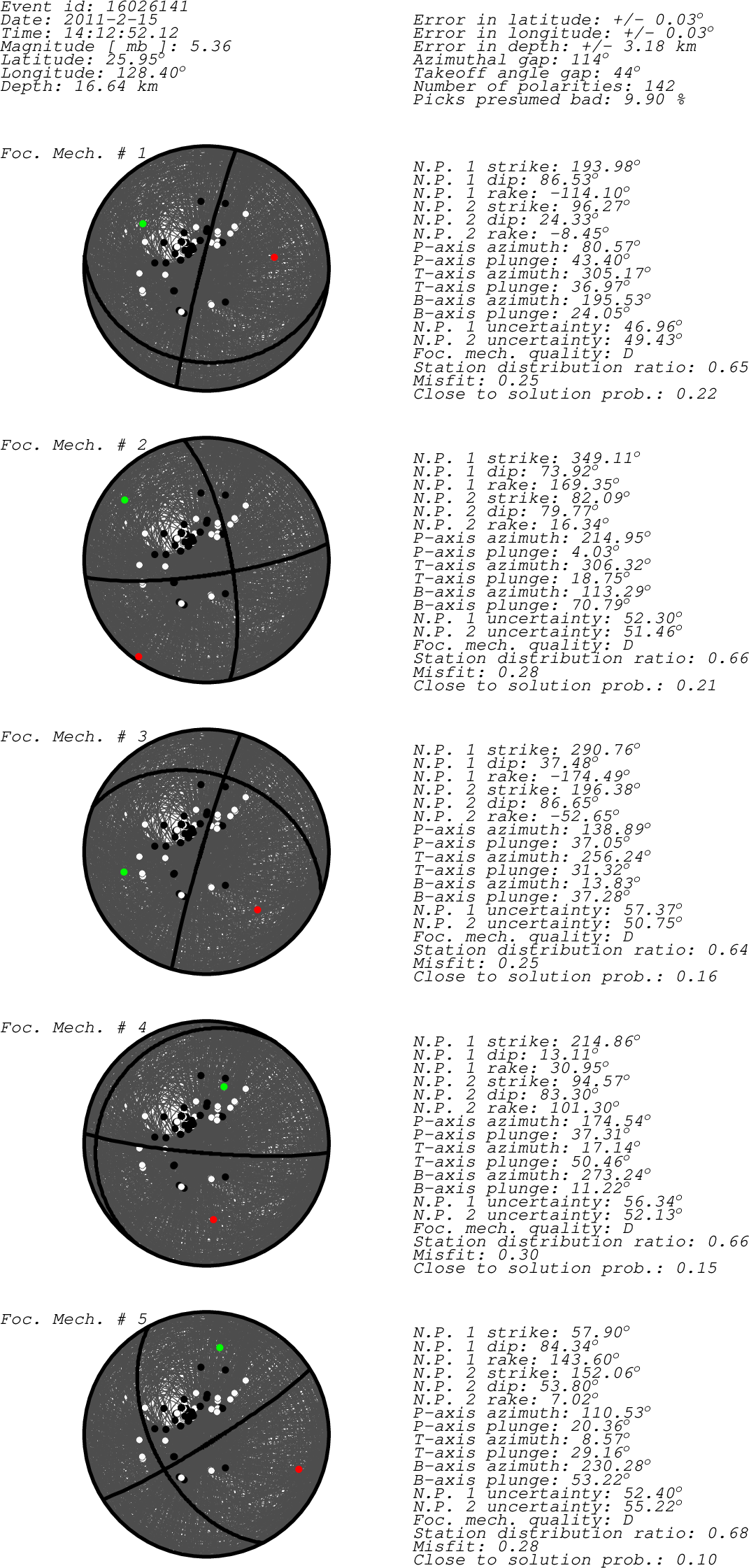 Black dots -> compressions (C,c,+,U,u) White dots -> dilatations (D,d,-) Green dot -> T-axis Red dot -> P-axis