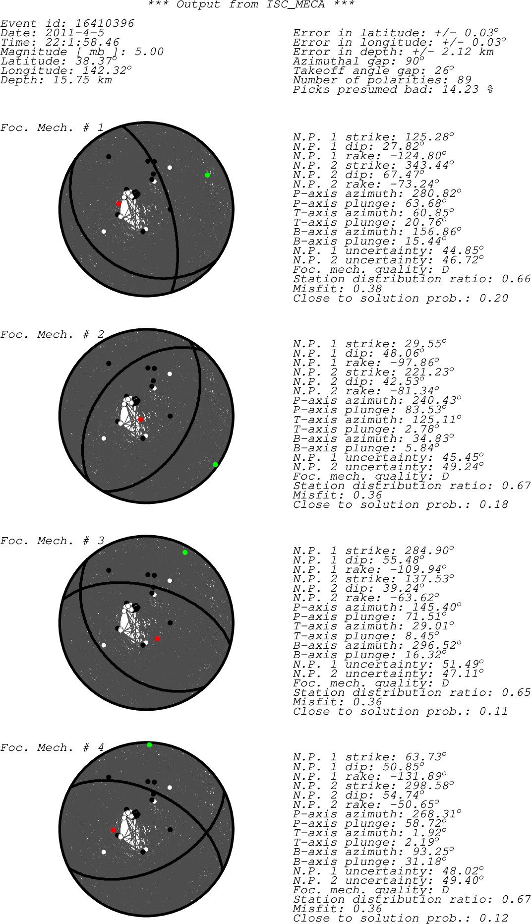 sta chan net loc pol a/m azi dist author irsta OFUJ ??? IR C 324.41 0.87 JMA OFUJ JMK ??? IR C 304.18 1.04 JMA JMK JOU ??? IR D 270.14 1.30 JMA JOU JMM ??? IR D 247.63 1.31 JMA JMM JOM ??? IR C 324.20 1.36 JMA JOM JFK ??? IR D 229.10 1.52 JMA JFK JYK ??? IR D 290.09 1.63 JMA JYK ERM B?Z IR C 9.74 3.69 MOS ERM MAJO B?Z IR D 242.07 3.75 MOS MAJO KUR S?Z IR D 29.37 8.01 MOS KUR YSS S?Z IR C 2.00 8.58 MOS YSS SNY ??? IR d 289.42 14.75 BJI SNY SSE ??? IR c 253.65 18.80 BJI SSE MA2 BHZ IU 00 + a 11.57 21.90 ISC MA2 SEY B?Z IR C 10.76 25.34 MOS SEY GYA ??? IR c 258.95 32.17 BJI GYA BILL S?Z IR D 16.49 32.54 MOS BILL KRAR S?Z IR C 314.86 37.01 MOS KRAR PHRA BHZ TM -- - a 253.58 41.54 ISC PHRA CMMT BHZ TM -- - a 255.05 42.32 ISC CMMT CHTO BHZ IU 10 - a 255.05 42.32 ISC CHTO NVS S?Z IR C 312.67 42.45 MOS NVS KUR11 BHZ KZ -- - a 307.03 45.66 ISC KUR11 KUR12 BHZ KZ -- - a 307.04 45.68 ISC KUR12 KUR13 BHZ KZ -- - a 307.05 45.70 ISC KUR13 KUR01 BHZ KZ -- - a 307.22 45.72 ISC KUR01 KUR14 BHZ KZ -- - a 307.06 45.72 ISC KUR14 KUR02 BHZ KZ -- - a 307.19 45.73 ISC KUR02 KUR15 BHZ KZ -- - a 307.07 45.74 ISC KUR15 KUR04 BHZ KZ -- - a 307.14 45.74 ISC KUR04 KUR09 BHZ KZ -- - a 306.98 45.79 ISC KUR09 KUR10 BHZ KZ -- - a 306.95 45.80 ISC KUR10 KUR18 BHZ KZ -- - a 307.12 45.81 ISC KUR18 KUR19 BHZ KZ -- - a 307.13 45.83 ISC KUR19 TKM2 BHZ KN -- - a 297.67 49.64 ISC TKM2 CHKZ BHZ KZ -- - a 312.43 49.93 ISC CHKZ KBK BHZ KN -- + a 297.55 50.17 ISC KBK BVAR BHZ KZ -- + a 311.64 50.21 ISC BVAR ZRN BHZ KZ -- - a 311.81 51.04 ISC ZRNK ZRNK BHZ KZ -- - a 311.81 51.04 ISC ZRNK KKAR BHZ KZ -- + a 299.51 53.08 ISC KKAR KIP B?Z IR C 90.39 53.53 MOS KIP ARU B?Z IR D 318.13 55.84 MOS ARU ABKAR BHZ KZ -- - a 309.75 57.63 ISC ABKAR WB0 BHZ AU -- - a 188.78 58.31 ISC WB0 WB7 BHZ AU -- - a 188.78 58.38 ISC WB7 WB5 BHZ AU -- - a 188.79 58.42 ISC WB5 WC2 BHZ AU -- - a 188.79 58.47 ISC WC2 WC1 BHZ AU -- + a 188.81 58.47 ISC WC1 WRAB B?Z IR C 188.80 58.48 MOS WRAB WR0 BHZ AU -- - a 188.59 58.48 ISC WR0 WR3 BHZ AU -- + a 188.76 58.49 ISC WR3 OBN S?Z IR C 323.22 67.45 MOS OBN VSU B?Z IR C 329.63 69.66 MOS VSU GOF S?Z IR D 311.79 69.74 MOS GOF STKA BHZ AU -- - a 180.66 69.89 ISC STKA KIV BHZ II 00 - a 310.97 70.57 ISC KIV NEY S?Z IR D 310.34 70.95 MOS NEY AKH ??? IR D 308.41 71.54 BUC AKH CHVG ??? IR D 310.17 71.64 BUC CHVG KIEV B?Z IR D 322.45 73.69 MOS KIEV IAS ??? IR D 320.51 76.84 BUC IAS PRAR ??? IR C 321.27 77.39 BUC PRAR KWP BHZ PL -- + a 324.61 77.46 ISC KWP TLCR ??? IR D 318.39 77.56 BUC TLCR BURAR ??? IR D 321.94 77.70 BUC BURAR TESR ??? IR C 320.44 77.76 BUC TESR CFR ??? IR D 318.71 77.92 BUC CFR ODBI ??? IR D 319.68 78.07 BUC ODBI VRI ??? IR C 319.92 78.17 BUC VRI TIRR ??? IR C 318.04 78.26 BUC TIRR OJC BHZ PL -- - a 326.42 78.33 ISC OJC GRER ??? IR C 319.44 78.38 BUC GRER ARCR ??? IR D 321.98 78.49 BUC ARCR BRTR B?Z IR C 311.79 78.50 MOS BRTR PGOR ??? IR C 319.08 78.70 BUC PGOR DOPR ??? IR C 320.66 78.77 BUC DOPR ISR ??? IR D 319.46 78.78 BUC ISR MSAB ??? IR D 318.06 78.82 BUC MSAB MLR ??? IR C 320.03 78.82 BUC MLR CJR ??? IR D 322.09 79.12 BUC CJR SULR ??? IR C 319.28 79.23 BUC SULR VOIR ??? IR D 320.44 79.31 BUC VOIR DRGR ??? IR D 322.59 79.49 BUC DRGR ARR ??? IR D 320.60 79.57 BUC ARR LOT ??? IR D 321.10 79.94 BUC LOT PSZ BHZ HU -- + a 324.79 79.98 ISC PSZ CLL ??Z IR + 330.48 80.29 CLL CLL CLL S?Z IR C 330.48 80.29 MOS CLL VRAC ??? IR D 327.39 80.39 BUC VRAC GZR ??? IR D 321.57 80.47 BUC GZR BZS ??? IR C 322.32 80.87 BUC BZS TAUT BHZ TH -- + a 330.93 81.05 ISC TAUT MDVR ??? IR D 321.69 81.43 BUC MDVR SOP BHZ HU -- + a 326.35 81.64 ISC SOP VTS ??? IR C 319.38 82.27 BUC VTS GRB2 BHZ GR -- - a 329.91 82.43 ISC GRB2 JAVS BHZ SL -- + a 326.54 84.11 ISC JAVS sta - Station code (FDSN) chan - channel code net - Network code (FDSN) loc - Location code (FDSN) pol - Polarity a/m - Automatic or manual pick azi - Event to station azimuth (in degrees) dist - Event to station distance (in degrees) author - Author of the polarity irsta - International registry station code