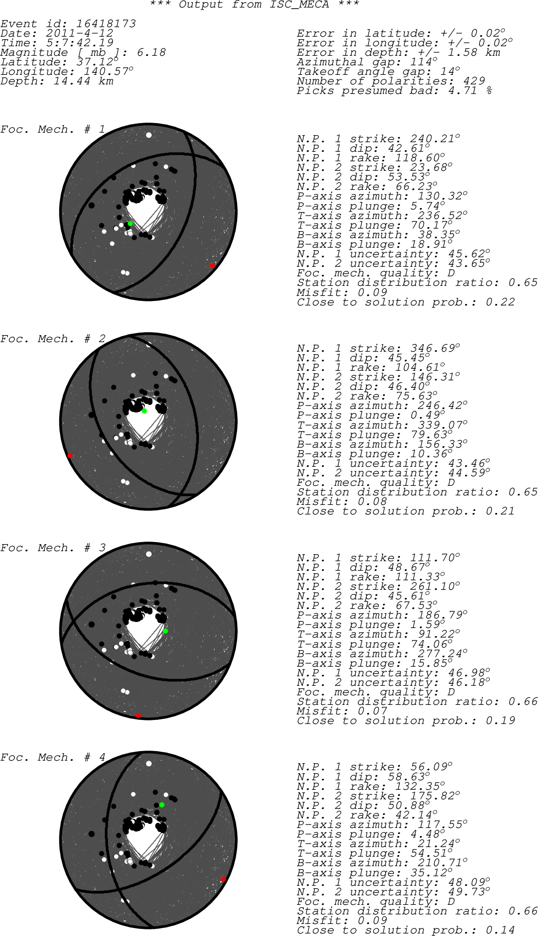 Black dots -> compressions (C,c,+,U,u) White dots -> dilatations (D,d,-) Green dot -> T-axis Red dot -> P-axis