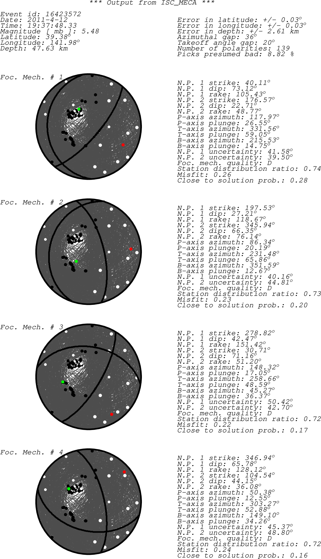 Black dots -> compressions (C,c,+,U,u) White dots -> dilatations (D,d,-) Green dot -> T-axis Red dot -> P-axis
