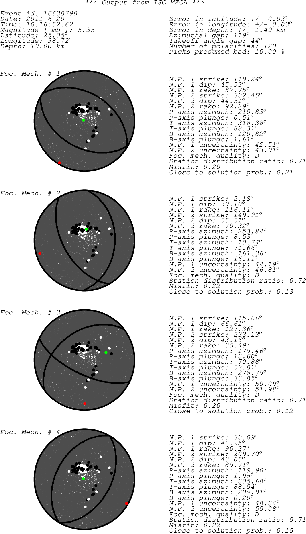 sta chan net loc pol a/m azi dist author irsta CHTO BHZ IU 10 - a 178.07 6.21 ISC CHTO GYA ??? IR c 77.19 7.30 BJI GYA CD2 BHZ CB 00 - a 36.17 7.34 ISC CD2 WHN ??? IR d 64.90 14.87 BJI WHN TIA ??? IR c 50.50 19.32 BJI TIA KULM HHZ IR d 174.31 19.73 KLM KULM IPM HHZ IR d 173.46 20.57 KLM IPM FRIM ELZ IR c 172.20 21.86 KLM FRIM KGM ELZ IR d 168.33 23.32 KLM KGM ULN B?Z IR C 14.04 23.71 MOS ULN KDM ELZ IR c 133.10 25.00 KLM KDM KKM HHZ IR d 135.53 25.26 KLM KKM MKAR BHZ KZ -- + a 333.01 25.36 ISC MKAR BOOM BHZ KR -- + a 318.47 25.59 ISC BOOM KZA BHZ KN -- - a 317.01 25.78 ISC KZA SBUM HHZ IR c 147.82 25.96 KLM SBUM KSM HHZ IR c 152.71 25.97 KLM KSM TKM2 BHZ KN -- + a 318.93 26.05 ISC TKM2 UCH BHZ KN -- + a 316.61 26.32 ISC UCH SNY ??? IR c 44.73 26.51 BJI SNY FRU S?Z IR D 317.83 26.59 MOS FRU TJN B?Z IR C 58.46 26.99 MOS TJN KBL BHZ IU -- - a 297.19 27.36 ISC KBL KURK B?Z IR C 334.04 29.95 MOS KURK KUR03 BHZ KZ -- + a 333.93 29.95 ISC KUR03 KUR02 BHZ KZ -- + a 333.96 29.96 ISC KUR02 NVS S?Z IR C 343.00 31.89 MOS NVS VLA B?Z IR C 48.07 32.57 MOS VLA MAJO B?Z IR C 61.67 35.57 MOS MAJO ZRN BHZ KZ -- + a 329.08 35.72 ISC ZRNK HABR B?Z IR C 41.14 36.82 MOS HABR TSK BHZ PS -- - a 62.52 37.06 ISC TSK ABKAR BHZ KZ -- + a 318.89 38.62 ISC ABKAR ERM B?Z IR D 53.87 40.23 MOS ERM SVE B?Z IR D 329.49 41.91 MOS SVE ARU B?Z IR C 328.09 42.68 MOS ARU GNI B?Z IR C 302.36 47.22 MOS GNI NCK S?Z IR D 306.82 48.23 MOS NCK GOF S?Z IR C 308.86 48.74 MOS GOF NEY B?Z IR D 306.44 48.85 MOS NEY KIV BHZ II 00 + a 307.37 48.91 ISC KIV TIXI B?Z IR C 12.05 49.62 MOS TIXI SEY S?Z IR C 28.02 51.66 MOS SEY OBN B?Z IR C 321.09 53.98 MOS OBN SIM B?Z IR C 308.51 55.07 MOS SIM WB0 BHZ AU -- + a 138.79 56.46 ISC WB0 WRAB B?Z IR C 138.95 56.57 MOS WRAB WC2 BHZ AU -- + a 138.93 56.57 ISC WC2 WR2 BHZ AU -- + a 138.95 56.58 ISC WR2 LVZ B?Z IR C 336.15 57.33 MOS LVZ APA S?Z IR D 335.64 57.72 MOS APA KIEV B?Z IR C 315.50 58.21 MOS KIEV PMG B?Z IR C 119.81 58.30 MOS PMG BILL B?Z IR C 24.02 58.64 MOS BILL SORM ??? IR C 312.53 58.89 BUC SORM SORM S?Z IR C 312.53 58.89 MOS SORM TIRR ??? IR C 308.25 59.16 BUC TIRR TIRR S?Z IR C 308.25 59.16 MOS TIRR CFR ??? IR C 309.11 59.28 BUC CFR CFR S?Z IR C 309.11 59.28 MOS CFR HARR ??? IR D 308.56 59.47 BUC HARR HARR S?Z IR D 308.56 59.47 MOS HARR VSU B?Z IR C 324.59 59.63 MOS VSU SUF BHZ HE -- + a 329.52 60.08 ISC SUF SUF HHZ HE -- + a 329.52 60.08 ISC SUF TESR ??? IR C 310.76 60.18 BUC TESR VRI ??? IR C 310.02 60.19 BUC VRI VRI S?Z IR C 310.02 60.19 MOS VRI PLOR ??? IR C 310.01 60.25 BUC PLOR PLOR S?Z IR C 310.01 60.25 MOS PLOR ISR ??? IR D 309.18 60.41 BUC ISR ISR S?Z IR D 309.18 60.41 MOS ISR MLR ??? IR D 309.66 60.78 BUC MLR MLR S?Z IR D 309.66 60.78 MOS MLR MEF BHZ HE -- + a 326.61 60.85 ISC MEF BURAR ??? IR D 312.14 61.04 BUC BURAR BURAR S?Z IR D 312.14 61.04 MOS BURAR DOPR ??? IR C 310.26 61.11 BUC DOPR VOIR ??? IR C 309.69 61.41 BUC VOIR VOIR S?Z IR C 309.69 61.41 MOS VOIR ARR ??? IR D 309.66 61.71 BUC ARR CJR ??? IR D 311.28 62.24 BUC CJR CJR S?Z IR D 311.28 62.24 MOS CJR KWP ??? IR C 314.63 62.46 BUC KWP KWP S?Z IR C 314.63 62.46 MOS KWP DRGR ??? IR C 311.46 62.84 BUC DRGR DRGR S?Z IR C 311.46 62.84 MOS DRGR SIRR ??? IR D 311.01 63.63 BUC SIRR BZS ??? IR C 310.30 63.77 BUC BZS BZS S?Z IR C 310.30 63.77 MOS BZS MDVR ??? IR C 309.37 63.85 BUC MDVR NIE S?Z IR C 314.64 64.04 MOS NIE OJC S?Z IR C 315.57 64.24 MOS OJC PSZ ??? IR C 313.04 64.55 BUC PSZ PSZ ??? IR c 313.04 64.55 BUD PSZ PSZ S?Z IR C 313.04 64.55 MOS PSZ MORC ??? IR D 315.36 65.75 BUC MORC MORC S?Z IR D 315.36 65.75 MOS MORC KSP S?Z IR C 316.67 66.34 MOS KSP SOP ??? IR c 313.26 66.80 BUD SOP PVCC BHZ CZ -- + a 316.58 67.48 ISC PVCC PVCC HHZ CZ -- + a 316.58 67.48 ISC PVCC PRU HHZ CZ -- + a 316.01 67.61 ISC PRU FBE BHZ SX -- + a 317.18 68.14 ISC FBE KONO B?Z IR C 326.87 68.30 MOS KONO KHC HHZ CZ -- + a 315.26 68.42 ISC KHC KHC BHZ CZ -- + a 315.26 68.42 ISC KHC SCHF BHZ SX -- + a 317.07 68.79 ISC SCHF WETR HHZ BW -- + a 315.40 68.86 ISC WET WETR BHZ BW -- + a 315.40 68.86 ISC WET NKC BHZ CZ -- + a 316.60 68.87 ISC NKC WERN HHZ SX -- - a 316.67 68.90 ISC WERN WERD BHZ SX -- + a 316.85 68.90 ISC WERD ROHR BHZ SX -- + a 316.62 68.95 ISC ROHR ROHR HHZ SX -- - a 316.62 68.95 ISC ROHR MLFH HHZ TH -- + a 317.24 68.96 ISC MLFH TRIB BHZ SX -- + a 316.78 69.03 ISC TRIB TRIB HHZ SX -- - a 316.78 69.03 ISC TRIB DAG S?Z IR C 347.56 71.72 MOS DAG DAG ??? IR C 347.56 71.72 DNK DAG LANF ??? IR C 316.20 72.11 STR LANF ECH ??? IR C 315.57 72.76 STR ECH MOF ??? IR C 315.21 72.89 STR MOF OG01 ??? IR C 313.81 73.67 STR OG01 GDM ??? IR C 312.85 74.42 STR GDM GRN ??? IR C 312.98 74.65 STR GRN PLDF ??? IR C 314.23 75.79 STR PLDF SCO S?Z IR C 342.67 76.05 MOS SCO SCO ??? IR C 342.67 76.05 DNK SCO AGO ??? IR C 314.43 76.08 STR AGO PYM ??? IR C 314.18 76.27 STR PYM LBL ??? IR C 313.62 76.31 STR LBL FRNF ??? IR C 313.95 76.70 STR FRNF LRDF ??? IR C 311.63 77.64 STR LRDF VALF ??? IR C 311.28 78.20 STR VALF SUMG S?Z IR C 347.93 78.40 MOS SUMG SUMG ??? IR C 347.93 78.40 DNK SUMG RESF ??? IR C 312.17 79.18 STR RESF VIEF ??? IR C 312.33 79.36 STR VIEF INK BHZ CN -- + a 17.40 79.38 ISC INK KULLO S?Z IR C 353.63 79.39 MOS KULLO KULLO ??? IR C 353.63 79.39 DNK KULLO ILULI S?Z IR C 349.60 83.49 MOS ILULI ILULI ??? IR C 349.60 83.49 DNK ILULI SFJD S?Z IR C 348.40 85.39 MOS SFJD SFJD ??? IR C 348.40 85.39 DNK SFJD sta - Station code (FDSN) chan - channel code net - Network code (FDSN) loc - Location code (FDSN) pol - Polarity a/m - Automatic or manual pick azi - Event to station azimuth (in degrees) dist - Event to station distance (in degrees) author - Author of the polarity irsta - International registry station code