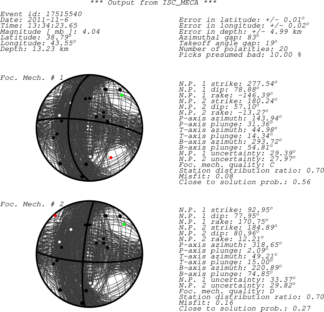 sta chan net loc pol a/m azi dist author irsta VMUR ??? IR c 5.36 0.20 AFAD VMUR TVAN ??? IR c 203.05 0.28 AFAD TVAN CLDR ??? IR c 39.12 0.46 AFAD CLDR GEVA ??? IR c 218.94 0.61 AFAD GEVA DYDN ??? IR c 8.26 0.76 AFAD DYDN BASK ??? IR d 153.91 0.82 AFAD BASK TUTA ??? IR d 317.17 0.84 AFAD TUTA TATV ??? IR c 254.71 1.04 AFAD TATV GURO HHZ KO -- + a 259.09 1.21 ISC GURO HAKT ??? IR d 174.12 1.24 AFAD HAKT EKAR ??? IR d 292.39 1.25 AFAD EKAR EATA ??? IR d 322.92 1.35 AFAD EATA CUKT BHZ KO -- - a 178.22 1.54 ISC CUKT GNI B?Z IR C 33.86 1.64 MOS GNI VRTB BHZ KO -- + a 283.43 1.67 ISC VRTB AKH ??? IR D 359.10 2.62 BUC AKH NEY S?Z IR C 352.29 4.50 MOS NEY NCK S?Z IR C 0.43 4.70 MOS NCK GOF S?Z IR C 356.73 6.28 MOS GOF VOIR ??? IR C 301.77 15.23 BUC VOIR AKASG B?Z IR C 324.27 15.63 MOS AKASG KIEV S?Z IR C 324.23 15.63 MOS KIEV BURAR ??? IR D 309.40 15.98 BUC BURAR BURAR ??? IR D 309.40 15.98 CSEM BURAR OBN B?Z IR C 346.18 17.00 MOS OBN ARU B?Z IR D 24.55 20.26 MOS ARU BRVK S?Z IR C 43.44 23.26 MOS BRVK AAK S?Z IR C 70.74 23.70 MOS AAK KURK B?Z IR C 52.66 27.35 MOS KURK MA2 S?Z IR C 32.38 65.21 MOS MA2 sta - Station code (FDSN) chan - channel code net - Network code (FDSN) loc - Location code (FDSN) pol - Polarity a/m - Automatic or manual pick azi - Event to station azimuth (in degrees) dist - Event to station distance (in degrees) author - Author of the polarity irsta - International registry station code