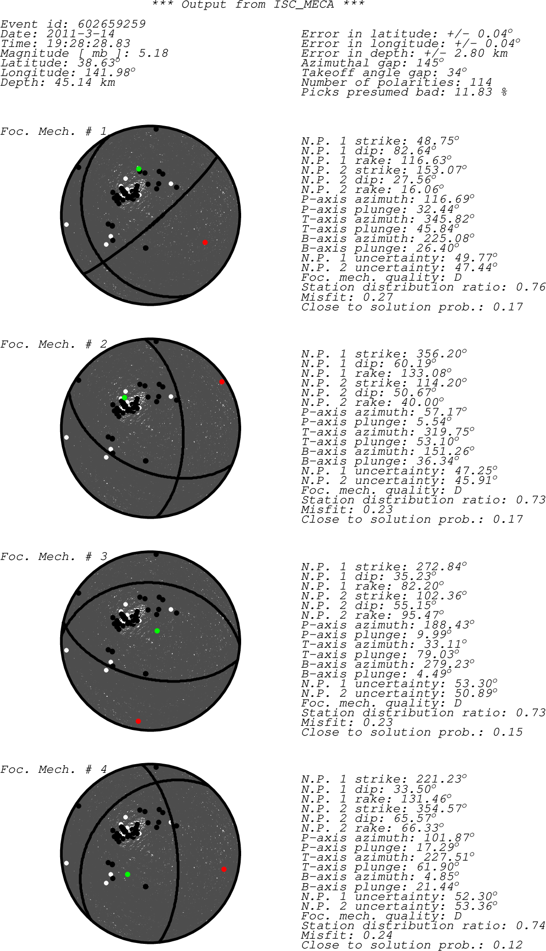 sta chan net loc pol a/m azi dist author irsta ERM B?Z IR D 14.47 3.50 MOS ERM MAJO S?Z IR C 236.43 3.65 MOS MAJO YSS S?Z IR C 3.65 8.34 MOS YSS VLA S?Z IR C 303.61 8.87 MOS VLA TJN B?Z IR D 263.58 11.83 MOS TJN SNY ??? IR c 288.63 14.42 BJI SNY TIA ??? IR d 270.76 19.88 BJI TIA SSLB BHZ TW -- - a 236.52 23.21 ISC SSLB TPUB BHZ TW -- + a 236.18 23.76 ISC TPUB QZH ??? IR d 242.27 24.03 BJI QZH YAK B?Z IR C 346.05 24.63 MOS YAK SEY B?Z IR C 11.21 25.14 MOS SEY BOD S?Z IR D 325.69 26.45 MOS BOD ULN S?Z IR C 301.46 26.87 MOS ULN GYA ??? IR c 258.27 31.96 BJI GYA BILL S?Z IR C 16.80 32.38 MOS BILL TIXI B?Z IR C 352.57 33.77 MOS TIXI KRAR B?Z IR D 314.66 36.65 MOS KRAR WMQ ??? IR c 295.30 40.55 BJI WMQ NVS S?Z IR C 312.45 42.08 MOS NVS CHTO BHZ IU 10 + a 254.50 42.13 ISC CHTO CMAR B?Z IR C 254.08 42.35 MOS CMAR MKAR BHZ KZ -- + a 300.80 43.67 ISC MKAR KDAK B?Z IR C 42.97 45.62 MOS KDAK COLA S?Z IR D 33.01 47.50 MOS COLA TARG BHZ KC -- + a 295.18 48.12 ISC TARG TKM2 BHZ KN -- + a 297.38 49.29 ISC TKM2 CHKZ BHZ KZ -- + a 312.21 49.57 ISC CHKZ VOS BHZ KZ -- + a 310.93 49.57 ISC VOSK KBK BHZ KN -- + a 297.25 49.82 ISC KBK BVAR BHZ KZ -- + a 311.42 49.85 ISC BVAR BRVK B?Z IR C 311.48 49.90 MOS BRVK USP BHZ KN -- + a 298.15 49.93 ISC USP AAK B?Z IR C 297.37 50.15 MOS AAK KSH ??? IR c 293.06 50.18 BJI KSH UCH BHZ KN -- + a 296.87 50.27 ISC UCH EKS2 BHZ KN -- + a 297.64 50.63 ISC EKS2 ZRN BHZ KZ -- + a 311.59 50.68 ISC ZRNK ZRNK BHZ KZ -- + a 311.59 50.68 ISC ZRNK KKAR BHZ KZ -- + a 299.23 52.73 ISC KKAR SVE B?Z IR D 317.97 54.26 MOS SVE ABKAR BHZ KZ -- + a 309.52 57.27 ISC ABKAR KBL BHZ IU -- + a 290.27 57.28 ISC KBL AKTO BHZ KZ -- + a 311.39 57.96 ISC AKTO WB0 BHZ AU -- + a 188.39 58.52 ISC WB0 WB7 BHZ AU -- + a 188.39 58.59 ISC WB7 WRAB BHZ II 00 + a 188.40 58.69 ISC WRAB WR0 BHZ AU -- + a 188.20 58.69 ISC WR0 WC3 BHZ AU -- - a 188.38 58.71 ISC WC3 LVZ S?Z IR C 335.57 60.85 MOS LVZ RES BHZ CN -- + a 14.75 60.95 ISC RES ABKT BHZ II 00 + a 298.50 63.47 ISC ABKT DAG BHZ GE -- + a 355.14 64.23 ISC DAG OBN S?Z IR C 323.04 67.09 MOS OBN FINES B?Z IR C 332.13 67.62 MOS FINES VSU B?Z IR C 329.46 69.31 MOS VSU GOF S?Z IR D 311.57 69.37 MOS GOF NCK S?Z IR C 309.96 69.93 MOS NCK NEY S?Z IR C 310.13 70.59 MOS NEY GNI S?Z IR C 306.52 71.12 MOS GNI AKH ??? IR C 308.19 71.18 BUC AKH AKH S?Z IR C 308.19 71.18 MOS AKH KLNR S?Z IR D 329.13 74.59 MOS KLNR FRB BHZ CN -- + a 13.52 75.12 ISC FRB LEOM ??? IR D 319.44 76.62 BUC LEOM LEOM S?Z IR D 319.44 76.62 MOS LEOM PRAR ??? IR D 321.07 77.03 BUC PRAR KWP BHZ PL -- + a 324.42 77.10 ISC KWP BURAR ??? IR C 321.75 77.34 BUC BURAR BURAR S?Z IR C 321.75 77.34 MOS BURAR TESR ??? IR C 320.24 77.40 BUC TESR CFR ??? IR D 318.51 77.56 BUC CFR CFR S?Z IR D 318.51 77.56 MOS CFR ODBI ??? IR D 319.48 77.71 BUC ODBI VRI ??? IR C 319.72 77.81 BUC VRI VRI S?Z IR C 319.72 77.81 MOS VRI PLOR ??? IR C 319.75 77.86 BUC PLOR TIRR ??? IR C 317.83 77.90 BUC TIRR OJC BHZ PL -- + a 326.23 77.97 ISC OJC HARR ??? IR C 318.25 77.99 BUC HARR HARR S?Z IR C 318.25 77.99 MOS HARR UZH M?Z IR C 323.90 78.01 MOS UZH GRER ??? IR D 319.24 78.02 BUC GRER ARCR ??? IR D 321.78 78.13 BUC ARCR BRTR B?Z IR C 311.58 78.14 MOS BRTR PGOR ??? IR C 318.88 78.33 BUC PGOR DOPR ??? IR D 320.46 78.41 BUC DOPR ISR ??? IR C 319.26 78.42 BUC ISR ISR S?Z IR C 319.26 78.42 MOS ISR MSAB ??? IR C 317.85 78.46 BUC MSAB MLR ??? IR D 319.83 78.46 BUC MLR MLR S?Z IR D 319.83 78.46 MOS MLR CJR ??? IR C 321.89 78.76 BUC CJR CJR S?Z IR C 321.89 78.76 MOS CJR SULR ??? IR D 319.08 78.87 BUC SULR VOIR ??? IR D 320.24 78.95 BUC VOIR VOIR S?Z IR D 320.24 78.95 MOS VOIR OKC ??? IR c 326.77 78.97 PRU OKC KSP BHZ PL -- + a 328.36 78.99 ISC KSP MTUR ??? IR C 320.08 79.09 BUC MTUR MTUR S?Z IR C 320.08 79.09 MOS MTUR ARR ??? IR D 320.40 79.21 BUC ARR DPC ??? IR c 328.02 79.35 PRU DPC DPC S?Z IR C 328.02 79.35 MOS DPC UPC ??? IR c 328.28 79.36 PRU UPC KRLC ??? IR c 327.61 79.37 PRU KRLC KRLC S?Z IR C 327.61 79.37 MOS KRLC PSZ ??? IR c 324.59 79.62 BUD PSZ HUMR ??? IR C 319.62 79.62 BUC HUMR PVCC ??? IR c 329.01 79.93 PRU PVCC CLL ??Z IR + 330.29 79.94 CLL CLL CLL S?Z IR C 330.29 79.94 MOS CLL SIRR ??? IR D 322.55 80.01 BUC SIRR VRAC ??? IR C 327.20 80.03 BUC VRAC VRAC S?Z IR C 327.20 80.03 MOS VRAC GZR ??? IR C 321.37 80.11 BUC GZR GOPC ??? IR c 328.51 80.32 PRU GOPC PRA ??? IR c 328.79 80.34 PRU PRA PRU ??? IR c 328.68 80.36 PRU PRU BZS ??? IR C 322.12 80.51 BUC BZS BZS S?Z IR C 322.12 80.51 MOS BZS TREC ??? IR c 327.75 80.51 PRU TREC CSKK ??? IR d 325.05 80.78 BUD CSKK BANR ??? IR D 322.21 80.91 BUC BANR PKST ??? IR c 325.10 80.95 BUD PKST NKC ??? IR c 329.90 81.01 PRU NKC MDVR ??? IR C 321.49 81.07 BUC MDVR SOP ??? IR c 326.15 81.29 BUD SOP KHC ??? IR c 328.63 81.42 PRU KHC PKSM ??? IR c 324.08 81.47 BUD PKSM ARSA BHZ OE -- + a 326.41 82.07 ISC ARSA TRI BHZ MN -- + a 326.39 84.03 ISC TRI APE B?Z IR C 314.00 84.60 MOS APE SENIN HHZ CH -- - a 330.43 86.16 ISC SENIN sta - Station code (FDSN) chan - channel code net - Network code (FDSN) loc - Location code (FDSN) pol - Polarity a/m - Automatic or manual pick azi - Event to station azimuth (in degrees) dist - Event to station distance (in degrees) author - Author of the polarity irsta - International registry station code