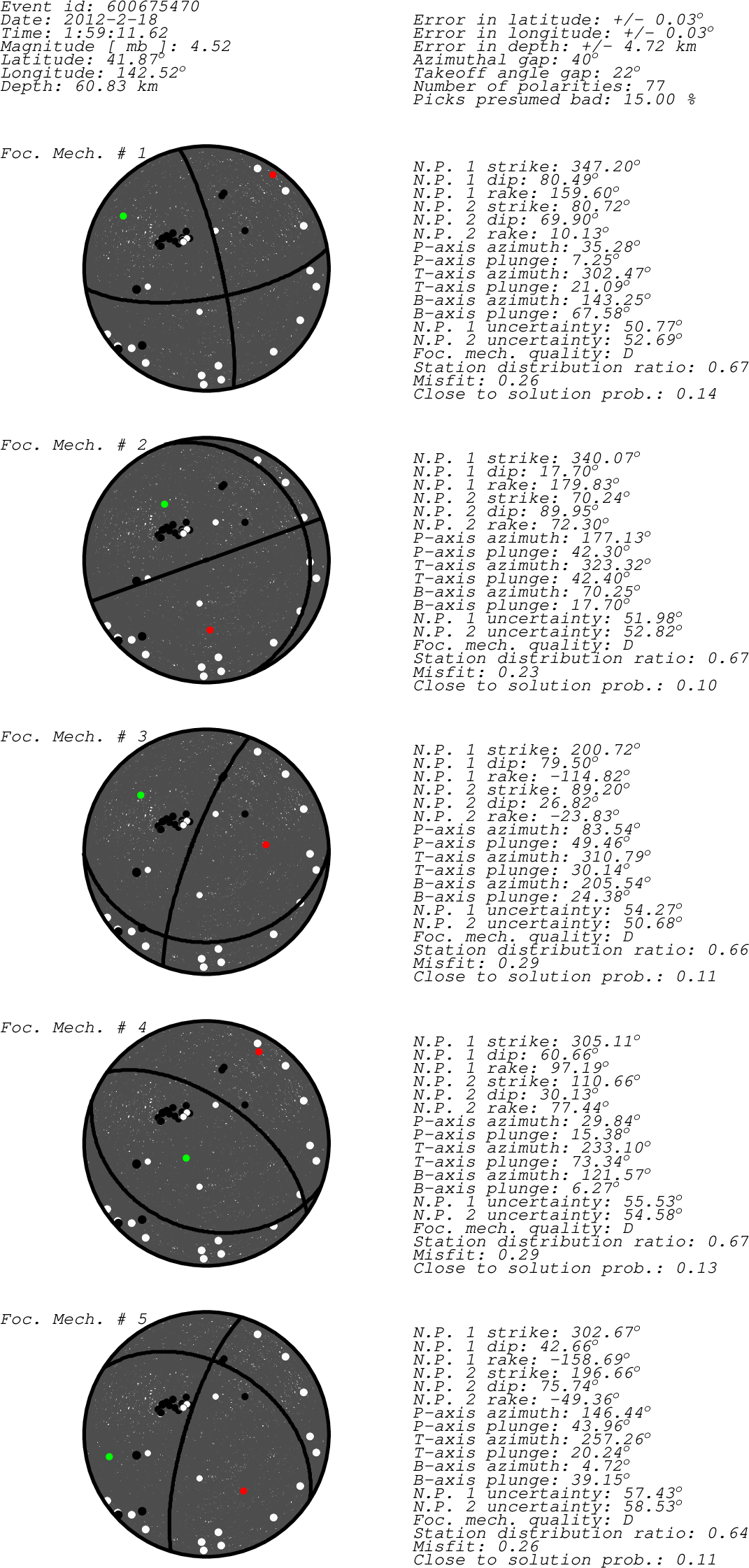 sta chan net loc pol a/m azi dist author irsta ERM B?Z IR C 73.38 0.50 MOS ERM JEM ??? IR C 73.29 0.50 JMA JEM JBT2 ??? IR D 352.84 0.91 JMA JBT2 JCH ??? IR C 40.02 0.97 JMA JCH JKB ??? IR D 271.18 1.11 JMA JKB JOT ??? IR D 246.42 1.21 JMA JOT JEW ??? IR D 321.00 1.25 JMA JEW JNB ??? IR D 298.86 1.25 JMA JNB JFR ??? IR D 2.46 1.29 JMA JFR JOB ??? IR D 43.05 1.42 JMA JOB JTM ??? IR D 225.61 1.54 JMA JTM JYM2 ??? IR D 279.33 1.62 JMA JYM2 JAB ??? IR D 352.50 1.64 JMA JAB JANG ??? IR D 207.13 1.68 JMA JANG JAR ??? IR D 32.62 1.70 JMA JAR ASAJ BHZ JP -- - a 1.38 2.24 ISC ASAJ GLVR B?Z IR D 48.84 2.89 MOS GLVR YUK B?Z IR C 47.54 3.27 MOS YUK SHO B?Z IR D 56.37 3.75 MOS SHO YSS S?Z IR D 1.83 5.08 MOS YSS KUR S?Z IR C 47.38 5.14 MOS KUR MA2 B?Z IR C 13.34 18.45 MOS MA2 SEY B?Z IR C 12.14 21.88 MOS SEY WHN ??? IR d 252.53 25.27 BJI WHN MK31 B?Z IR C 297.90 42.44 MOS MK31 MKAR BHZ KZ -- + a 297.90 42.44 ISC MKAR KDAK B?Z IR C 45.33 43.01 MOS KDAK KUR11 BHZ KZ -- + a 304.20 43.75 ISC KUR11 KURK B?Z IR C 304.37 43.76 MOS KURK KUR13 BHZ KZ -- + a 304.22 43.78 ISC KUR13 KUR01 BHZ KZ -- + a 304.39 43.80 ISC KUR01 KUR14 BHZ KZ -- + a 304.24 43.80 ISC KUR14 KUR02 BHZ KZ -- + a 304.37 43.80 ISC KUR02 KUR03 BHZ KZ -- + a 304.34 43.81 ISC KUR03 KUR15 BHZ KZ -- + a 304.25 43.82 ISC KUR15 KUR05 BHZ KZ -- + a 304.29 43.83 ISC KUR05 KUR06 BHZ KZ -- + a 304.24 43.85 ISC KUR06 KUR07 BHZ KZ -- + a 304.21 43.86 ISC KUR07 KUR16 BHZ KZ -- + a 304.27 43.86 ISC KUR16 KUR08 BHZ KZ -- + a 304.18 43.87 ISC KUR08 KUR09 BHZ KZ -- + a 304.16 43.88 ISC KUR09 KUR17 BHZ KZ -- + a 304.29 43.88 ISC KUR17 KUR10 BHZ KZ -- + a 304.13 43.88 ISC KUR10 KUR18 BHZ KZ -- + a 304.30 43.90 ISC KUR18 KUR20 BHZ KZ -- + a 304.33 43.93 ISC KUR20 BVAR BHZ KZ -- + a 309.38 48.06 ISC BVAR BRVK B?Z IR C 309.45 48.11 MOS BRVK TKM2 HHZ KN -- + a 295.01 48.22 ISC TKM2 KBK HHZ KN -- + a 294.94 48.76 ISC KBK KBK BHZ KN -- + a 294.94 48.76 ISC KBK KZA BHZ KN -- - a 294.11 48.79 ISC KZA USP HHZ KN -- - a 295.85 48.83 ISC USP USP BHZ KN -- + a 295.85 48.83 ISC USP EKS2 BHZ KN -- + a 295.40 49.55 ISC EKS2 SVE S?Z IR C 316.44 52.16 MOS SVE ARU B?Z IR C 316.50 53.37 MOS ARU AB31 B?Z IR C 308.02 55.55 MOS AB31 WB0 BHZ AU -- - a 188.69 61.79 ISC WB0 FINES B?Z IR C 331.65 64.95 MOS FINES GOF S?Z IR C 310.85 67.54 MOS GOF AKASG B?Z IR C 321.85 71.01 MOS AKASG FRB BHZ CN -- - a 13.97 71.88 ISC FRB SORM S?Z IR C 320.33 73.20 MOS SORM SORM ??? IR C 320.33 73.20 BUC SORM BURAR ??? IR D 321.52 75.05 BUC BURAR TESR ??? IR D 320.00 75.17 BUC TESR CFR S?Z IR D 318.26 75.40 MOS CFR CFR ??? IR D 318.26 75.40 BUC CFR PGOR ??? IR D 318.67 76.16 BUC PGOR BRTR B?Z IR C 311.31 76.29 MOS BRTR CJR S?Z IR D 321.72 76.47 MOS CJR CJR ??? IR D 321.72 76.47 BUC CJR VOIR S?Z IR C 320.07 76.72 MOS VOIR VOIR ??? IR C 320.07 76.72 BUC VOIR MORC S?Z IR C 326.93 76.77 MOS MORC MORC ??? IR C 326.93 76.77 BUC MORC DRGR S?Z IR D 322.24 76.81 MOS DRGR DRGR ??? IR D 322.24 76.81 BUC DRGR ARR ??? IR D 320.24 76.97 BUC ARR VRAC S?Z IR D 327.12 77.53 MOS VRAC VRAC ??? IR D 327.12 77.53 BUC VRAC SIRR ??? IR C 322.44 77.69 BUC SIRR BZS S?Z IR C 322.03 78.20 MOS BZS BZS ??? IR C 322.03 78.20 BUC BZS MDVR ??? IR C 321.42 78.79 BUC MDVR VTS S?Z IR D 319.12 79.72 MOS VTS VTS ??? IR D 319.12 79.72 BUC VTS BFO B?Z IR C 331.06 81.50 MOS BFO sta - Station code (FDSN) chan - channel code net - Network code (FDSN) loc - Location code (FDSN) pol - Polarity a/m - Automatic or manual pick azi - Event to station azimuth (in degrees) dist - Event to station distance (in degrees) author - Author of the polarity irsta - International registry station code