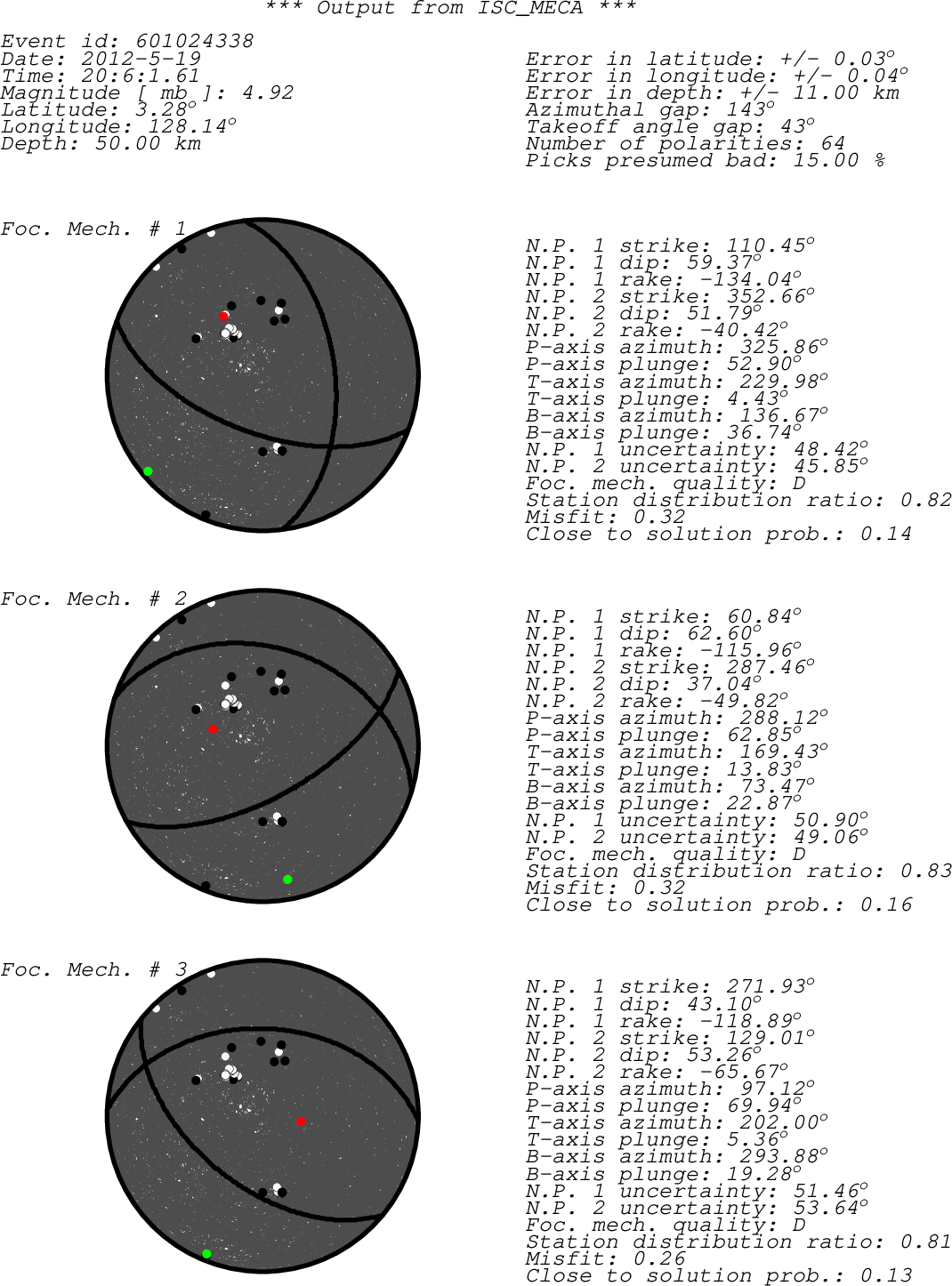 sta chan net loc pol a/m azi dist author irsta DMPH ??? IR c 325.37 4.59 MAN DMPH KCP ??? IR c 320.79 4.79 MAN KCP BIPH ??? IR d 340.14 5.18 MAN BIPH CTBH ??? IR d 315.44 5.51 MAN CTBH SANI BHZ GE -- + a 202.10 5.71 ISC SANI RCP ??? IR c 327.28 9.81 MAN RCP WB0 BHZ AU -- + a 165.22 23.71 ISC WB0 WB9 BHZ AU -- - a 165.25 23.74 ISC WB9 WB7 BHZ AU -- - a 165.29 23.78 ISC WB7 WB6 BHZ AU -- - a 165.33 23.79 ISC WB6 WRAB BHZ II 00 + a 165.40 23.87 ISC WRAB WR2 BHZ AU -- - a 165.40 23.88 ISC WR2 WR3 BHZ AU -- + a 165.35 23.89 ISC WR3 WR0 BHZ AU -- - a 165.01 23.94 ISC WR0 AS06 SHZ AU -- - a 168.30 27.36 ISC AS06 AS04 SHZ AU -- - a 168.39 27.37 ISC AS04 AS02 SHZ AU -- + a 168.38 27.39 ISC AS02 AS18 SHZ AU -- + a 168.30 27.41 ISC AS18 AS19 SHZ AU -- - a 168.34 27.42 ISC AS19 WRKA BHZ AU -- + a 179.69 28.15 ISC WRKA PBKT BHZ TM -- + a 298.17 29.78 ISC PBKT WHN ??? IR c 335.79 30.09 BJI WHN CMMT BHZ TM -- - a 300.58 32.45 ISC CMMT CHTO BHZ IU 10 - a 300.58 32.45 ISC CHTO TJN B?Z IR C 358.85 32.94 MOS TJN MAJO BHZ IU 10 + a 14.44 34.38 ISC MAJO BBOO BHZ AU -- - a 168.79 36.67 ISC BBOO LZH ??? IR d 328.49 39.61 BJI LZH YSS S?Z IR D 14.07 45.31 MOS YSS PET S?Z IR C 21.82 55.61 MOS PET MAKZ BHZ IU 00 - a 324.65 58.91 ISC MAKZ KZA HHZ KN -- - a 317.20 60.89 ISC KZA KZA BHZ KN -- - a 317.20 60.89 ISC KZA TKM2 HHZ KN -- - a 318.19 61.01 ISC TKM2 UCH HHZ KN -- + a 317.10 61.45 ISC UCH CHM BHZ KN -- - a 317.98 61.61 ISC CHMS CHM HHZ KN -- - a 317.98 61.61 ISC CHMS USP BHZ KN -- - a 318.17 61.89 ISC USP USP HHZ KN -- - a 318.17 61.89 ISC USP AML HHZ KN -- - a 316.72 61.97 ISC AML SEY B?Z IR C 12.27 62.16 MOS SEY KUR11 BHZ KZ -- - a 327.01 62.78 ISC KUR11 KUR13 BHZ KZ -- - a 326.99 62.82 ISC KUR13 KUR14 BHZ KZ -- - a 326.99 62.84 ISC KUR14 KUR10 BHZ KZ -- - a 326.86 62.84 ISC KUR10 KUR08 BHZ KZ -- - a 326.90 62.85 ISC KUR08 KUR15 BHZ KZ -- - a 326.98 62.85 ISC KUR15 KUR06 BHZ KZ -- - a 326.95 62.87 ISC KUR06 KUR21 BHZ KZ -- - a 326.97 62.87 ISC KUR21 KURK B?Z IR C 327.09 62.87 MOS KURK KUR05 BHZ KZ -- - a 326.99 62.88 ISC KUR05 KUR04 BHZ KZ -- - a 327.01 62.89 ISC KUR04 KUR16 BHZ KZ -- - a 326.96 62.89 ISC KUR16 KUR03 BHZ KZ -- - a 327.03 62.89 ISC KUR03 KUR02 BHZ KZ -- - a 327.06 62.90 ISC KUR02 KUR01 BHZ KZ -- - a 327.08 62.91 ISC KUR01 KUR17 BHZ KZ -- - a 326.95 62.91 ISC KUR17 KUR19 BHZ KZ -- - a 326.94 62.95 ISC KUR19 KUR20 BHZ KZ -- - a 326.93 62.97 ISC KUR20 KKAR BHZ KZ -- - a 316.75 64.52 ISC KKAR BVAR BHZ KZ -- - a 326.69 68.46 ISC BVAR BRVK B?Z IR C 326.69 68.53 MOS BRVK ABKAR BHZ KZ -- - a 320.59 73.38 ISC ABKAR AKTO BHZ KZ -- + a 321.47 74.88 ISC AKTO SVE S?Z IR D 328.29 75.08 MOS SVE ARU B?Z IR C 327.56 76.06 MOS ARU FINES B?Z IR C 331.93 92.89 MOS FINES sta - Station code (FDSN) chan - channel code net - Network code (FDSN) loc - Location code (FDSN) pol - Polarity a/m - Automatic or manual pick azi - Event to station azimuth (in degrees) dist - Event to station distance (in degrees) author - Author of the polarity irsta - International registry station code