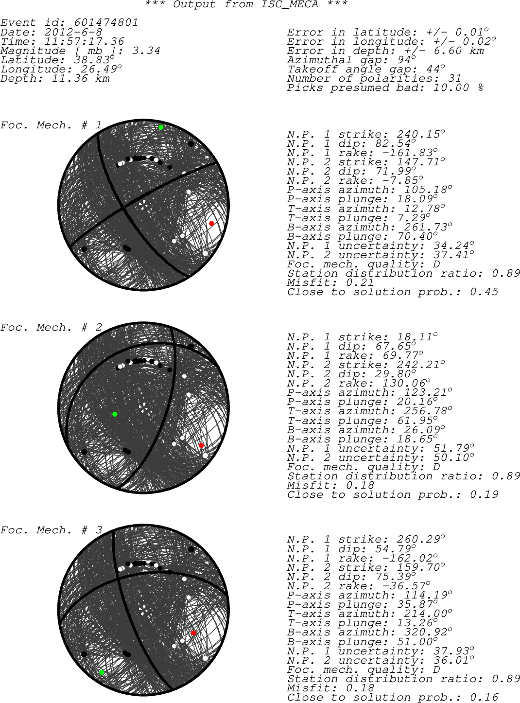 sta chan net loc pol a/m azi dist author irsta DKL BHZ KO -- + a 53.19 0.41 ISC DKL CHOS HHZ HT -- + a 218.00 0.56 ISC CHOS SIGR HHZ HT -- - a 307.93 0.62 ISC SIGR BALB BHZ KO -- - a 52.71 1.35 ISC BALB AYDB BHZ KO -- - a 128.21 1.41 ISC AYDB GADA BHZ KO -- + a 341.63 1.44 ISC GADA KRBG BHZ KO -- + a 21.55 1.68 ISC KRBG EDC BHZ KO -- + a 34.56 1.85 ISC EDC APE ??? IR C 203.61 1.91 BUC APE RKY BHZ KO -- - a 15.75 1.93 ISC RKY ALN HHZ HT -- + a 350.84 2.09 ISC ALN ALN BHZ HT -- + a 350.84 2.09 ISC ALN YER BHZ KO -- - a 139.41 2.21 ISC YER TVSB BHZ KO -- - a 74.06 2.39 ISC TVSB SANT ??? IR C 198.75 2.59 BUC SANT SANT ??? IR C 198.75 2.59 CSEM SANT DALY BHZ KO -- + a 138.87 2.64 ISC DALY IDI ??? IR C 200.38 3.76 BUC IDI IDI ??? IR C 200.38 3.76 CSEM IDI VTS ??? IR C 327.49 4.51 BUC VTS VTS ??? IR C 327.49 4.51 CSEM VTS ICOR ??? IR C 10.14 5.37 BUC ICOR ICOR ??? IR C 10.14 5.37 CSEM ICOR TIRR ??? IR C 13.75 5.81 BUC TIRR TIRR ??? IR C 13.75 5.81 CSEM TIRR TLB ??? IR C 10.92 5.87 BUC TLB TLB ??? IR C 10.92 5.87 CSEM TLB MLR ??? IR C 356.70 6.67 BUC MLR MLR ??? IR C 356.70 6.67 CSEM MLR ARR ??? IR C 348.68 6.68 BUC ARR ARR ??? IR C 348.68 6.68 CSEM ARR VOIR ??? IR C 351.27 6.69 BUC VOIR VOIR ??? IR C 351.27 6.69 CSEM VOIR LOT ??? IR D 343.90 6.92 BUC LOT LOT ??? IR D 343.90 6.92 CSEM LOT MDVR ??? IR D 330.59 6.93 BUC MDVR MDVR ??? IR D 330.59 6.93 CSEM MDVR MDVR HHZ RO -- - a 330.58 6.93 ISC MDVR PLOR ??? IR C 0.92 7.02 BUC PLOR PLOR ??? IR C 0.92 7.02 CSEM PLOR TESR ??? IR C 0.83 7.68 BUC TESR TESR ??? IR C 0.83 7.68 CSEM TESR BZS ??? IR D 333.53 7.68 BUC BZS BZS ??? IR D 333.53 7.68 CSEM BZS BURAR ??? IR C 354.39 8.83 BUC BURAR BURAR ??? IR C 354.39 8.83 CSEM BURAR sta - Station code (FDSN) chan - channel code net - Network code (FDSN) loc - Location code (FDSN) pol - Polarity a/m - Automatic or manual pick azi - Event to station azimuth (in degrees) dist - Event to station distance (in degrees) author - Author of the polarity irsta - International registry station code