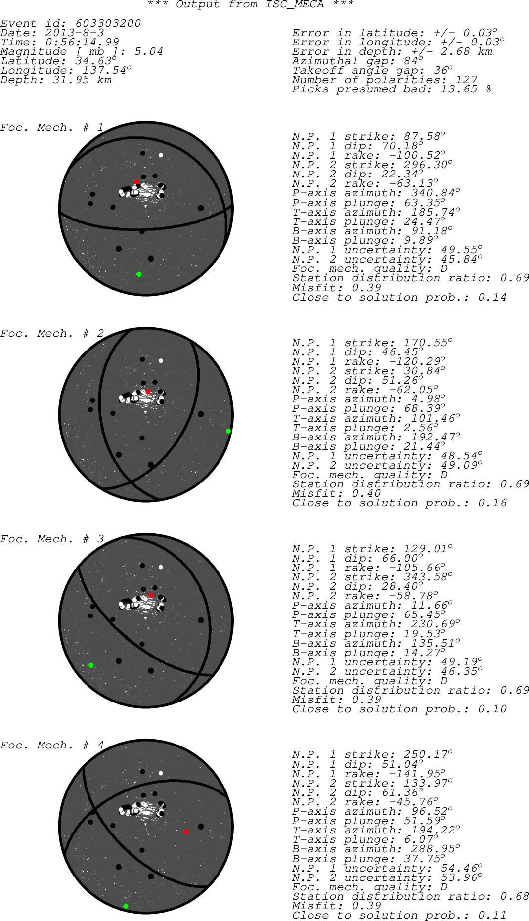 sta chan net loc pol a/m azi dist author irsta HMMJ ??? IR C 33.94 0.27 JMA HMMJ JSSY ??? IR C 354.44 0.28 JMA JSSY JAA ??? IR C 269.69 0.33 JMA JAA TK04 ??? IR C 131.87 0.37 JMA TK04 TTO5 ??? IR C 159.07 0.41 JMA TTO5 TK02 ??? IR C 165.28 0.71 JMA TK02 JIE ??? IR C 250.88 0.73 JMA JIE TSUJ ??? IR C 274.98 0.93 JMA TSUJ JIZS ??? IR C 85.29 1.11 JMA JIZS JKN2 ??? IR C 249.73 1.12 JMA JKN2 JYTA ??? IR C 325.65 1.16 JMA JYTA JYN ??? IR C 43.42 1.19 JMA JYN MAJO B?Z IR D 15.73 1.98 MOS MAJO TJN B?Z IR C 284.75 8.48 MOS TJN TEY S?Z IR C 356.32 10.41 MOS TEY SNY ??? IR c 307.33 13.11 BJI SNY MA2 B?Z IR C 15.17 26.42 MOS MA2 CD2 ??? IR c 272.08 28.57 BJI CD2 TIXI S?Z IR C 355.49 37.36 MOS TIXI MKAR BHZ KZ -- - a 303.77 42.78 ISC MKAR KURK B?Z IR C 309.63 44.98 MOS KURK AAK B?Z IR C 299.18 48.88 MOS AAK BRVK B?Z IR C 313.35 49.95 MOS BRVK RDJH BHZ AV -- + a 36.73 50.69 ISC RDJH RED BHZ AV -- + a 36.96 50.71 ISC RED KDAK B?Z IR C 40.35 50.97 MOS KDAK KKAR BHZ KZ -- - a 300.66 51.62 ISC KKAR GHO BHZ AK -- + a 35.08 52.49 ISC GHO WRH BHZ AK -- + a 31.65 52.69 ISC WRH SAW BHZ AK -- - a 35.01 52.77 ISC SML PWL BHZ AK -- + a 36.20 52.86 ISC PWL POKR BHZ TA 01 - a 30.81 52.93 ISC POKR POKR BHZ TA -- - a 30.81 52.93 ISC POKR HDA BHZ AK -- - a 31.68 53.19 ISC HDA EYAK BHZ AK -- - a 36.39 54.16 ISC EYAK RIDG BHZ AK -- - a 32.41 54.17 ISC RIDG SVE S?Z IR C 319.11 54.88 MOS SVE ARU B?Z IR D 318.92 56.08 MOS ARU APA S?Z IR D 335.44 63.57 MOS APA FORT BHZ AU -- + a 188.95 65.67 ISC FORT JOF BHZ HE -- - a 331.38 66.58 ISC JOF TRO H?Z IR C 340.49 66.94 BER TRO DAG S?Z IR D 354.24 67.86 MOS DAG DAG ??? IR D 354.24 67.86 DNK DAG OBN B?Z IR C 322.56 68.11 MOS OBN KIV ??? IR D 310.05 70.07 BUC KIV LLLB BHZ CN -- - a 41.75 70.15 ISC LLLB MOR8 H?Z IR D 338.83 70.49 BER MOR8 GNI B?Z IR D 305.73 70.58 MOS GNI AKH ??? IR D 307.39 70.79 BUC AKH SHUK BHZ UW -- - a 43.28 71.16 ISC SHUK B05D BHZ TA -- - a 43.97 71.23 ISC B05A RATT BHZ UW -- - a 44.61 71.83 ISC RATT OBSR BHZ CC -- - a 45.09 72.10 ISC OBSR SUMG S?Z IR D 358.74 73.04 MOS SUMG SUMG ??? IR D 358.74 73.04 DNK SUMG DAVN BHZ UW -- - a 42.94 73.64 ISC C09A HAWA BHZ US 00 + a 44.66 73.70 ISC HAWA MSO BHZ US 00 + a 42.01 76.62 ISC MSO MILM ??? IR C 318.15 76.68 BUC MILM IAS ??? IR D 318.91 77.19 BUC IAS PAH HHZ NN -- - a 50.32 77.52 ISC PAHR TLCR ??? IR C 316.73 77.71 BUC TLCR GIRR ??? IR C 319.17 77.91 BUC GIRR YER HHZ NN -- + a 50.86 78.02 ISC YERR CFR ??? IR D 317.02 78.10 BUC CFR TESR ??? IR D 318.75 78.11 BUC TESR BIZ ??? IR D 319.33 78.14 BUC BIZ BURAR ??? IR D 320.25 78.19 BUC BURAR BUR01 BHZ RO -- - a 320.25 78.19 ISC BUR01 KWP BHZ PL -- - a 322.92 78.19 ISC KWP DLMT BHZ IW 00 - a 42.63 78.25 ISC DLMT HLID BHZ US 00 - a 44.90 78.30 ISC HLID ODBI ??? IR C 317.97 78.35 BUC ODBI BMN BHZ LB -- - a 48.74 78.46 ISC BMN VRI ??? IR C 318.19 78.46 BUC VRI ANTO ??? IR D 310.57 78.48 BUC ANTO HARR ??? IR C 316.71 78.51 BUC HARR PLOR ??? IR D 318.22 78.52 BUC PLOR BOZ BHZ US 00 - a 42.02 78.64 ISC BOZ BISRR ??? IR D 317.95 78.67 BUC BISRR KVN HHZ NN -- - a 50.29 78.71 ISC KVN ICOR ??? IR C 316.31 78.94 BUC ICOR ARCR ??? IR C 320.21 78.98 BUC ARCR MLR ??? IR D 318.24 79.13 BUC MLR DOPR ??? IR D 318.87 79.13 BUC DOPR OJC BHZ PL -- - a 324.64 79.22 ISC OJC TRPA ??? IR D 321.83 79.25 BUC TRPA SECR ??? IR C 317.82 79.34 BUC SECR VOIR ??? IR D 318.60 79.65 BUC VOIR ARR ??? IR C 318.74 79.92 BUC ARR RAZG ??? IR C 316.46 80.01 BUC RAZG DRGR ??? IR D 320.72 80.03 BUC DRGR HVU HHZ UU 01 + a 45.59 80.34 ISC HVU MORC ??? IR D 325.31 80.59 BUC MORC PHSR ??? IR C 314.45 80.63 BUC PHSR PSZ ??? IR D 322.86 80.72 BUC PSZ ELND ??? IR D 316.25 80.77 BUC ELND GZR ??? IR D 319.61 80.91 BUC GZR SRE ??? IR C 318.85 81.15 BUC SRE HWUT BHZ US 00 + a 45.16 81.16 ISC HWUT JAVC BHZ CZ -- - a 324.58 81.17 ISC JAVC PLVB ??? IR D 317.20 81.19 BUC PLVB EDW2 BHZ CI -- + a 53.66 81.22 ISC EDW2 DUG BHZ US 00 - a 46.87 81.30 ISC DUG BZS ??? IR C 320.32 81.37 BUC BZS PVCC BHZ CZ -- - a 327.21 81.42 ISC PVCC CLL S?Z IR D 328.48 81.55 MOS CLL CLL ??Z IR - 328.48 81.55 CLL CLL SHP HHZ NN -- - a 50.95 82.10 ISC SHPR MPU HHZ UU 01 + a 46.44 82.12 ISC MPU MLFH BHZ TH -- - a 328.56 82.33 ISC MLFH GRZ1 BHZ TH -- - a 328.42 82.34 ISC GRZ1 VTS ??? IR C 317.27 82.46 BUC VTS WERN BHZ SX -- - a 328.07 82.57 ISC WERN TRIB HHZ SX -- + a 328.23 82.62 ISC TRIB GMR BHZ CI -- - a 52.58 82.81 ISC GMRC KHC BHZ CZ -- - a 326.70 82.88 ISC KHC RDMU HHZ UU 01 - a 45.00 82.98 ISC RDMU DAN BHZ CI -- + a 52.56 83.08 ISC DANC SRU HHZ UU 01 - a 46.60 83.35 ISC SRU GRA1 BHZ GR -- - a 328.22 83.51 ISC GRF GRA4 BHZ GR -- - a 328.03 83.51 ISC GRA4 GRFO BHZ IU -- + a 328.22 83.51 ISC GRFO GRC1 HHZ GR -- + a 327.61 83.90 ISC GRC1 BLY ??? IR D 321.83 84.26 BUC BLY FUR HHZ GR -- + a 327.17 84.62 ISC FUR FUR BHZ GR -- - a 327.17 84.62 ISC FUR PDG ??? IR C 319.11 84.78 BUC PDG MEM SHZ IR d 331.39 84.97 UCC MEM BCLA SHZ IR d 331.63 85.40 UCC BCLA BFO B?Z IR C 328.77 85.79 MOS BFO CGRP HHZ NI -- + a 325.36 86.08 ISC CGRP FUORN HHZ CH -- - a 326.66 86.24 ISC FUORN DAVOX HHZ CH -- - a 326.96 86.29 ISC DAVOX HASLI BHZ CH -- + a 327.86 87.08 ISC HASLI HASLI HHZ CH -- + a 327.86 87.08 ISC HASLI MUGIO BHZ CH -- + a 326.85 87.32 ISC MUGIO ANMO B?Z IR C 47.61 88.53 MOS ANMO sta - Station code (FDSN) chan - channel code net - Network code (FDSN) loc - Location code (FDSN) pol - Polarity a/m - Automatic or manual pick azi - Event to station azimuth (in degrees) dist - Event to station distance (in degrees) author - Author of the polarity irsta - International registry station code
