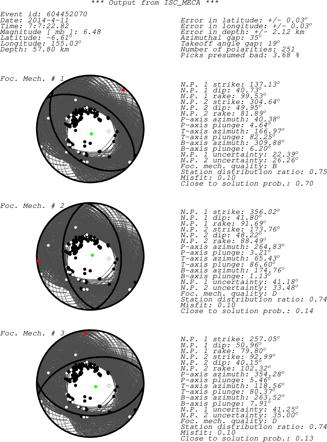Black dots -> compressions (C,c,+,U,u) White dots -> dilatations (D,d,-) Green dot -> T-axis Red dot -> P-axis