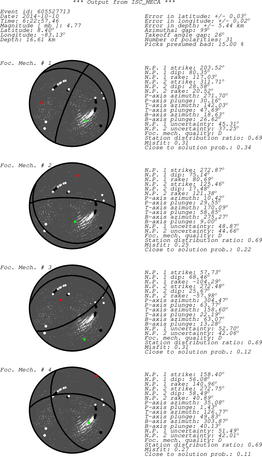 Black dots -> compressions (C,c,+,U,u) White dots -> dilatations (D,d,-) Green dot -> T-axis Red dot -> P-axis