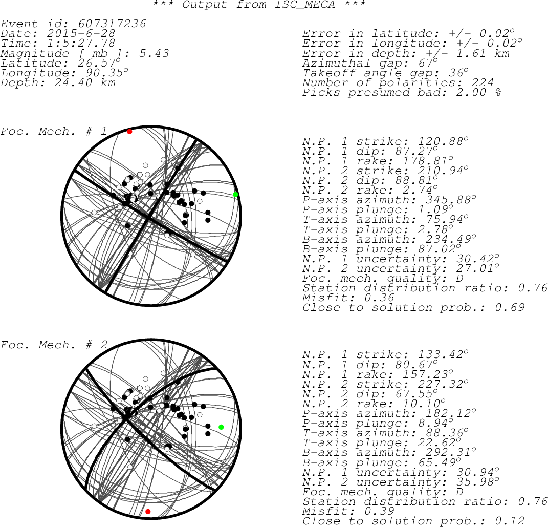 Black dots -> compressions (C,c,+,U,u) White dots -> dilatations (D,d,-) Green dot -> T-axis Red dot -> P-axis