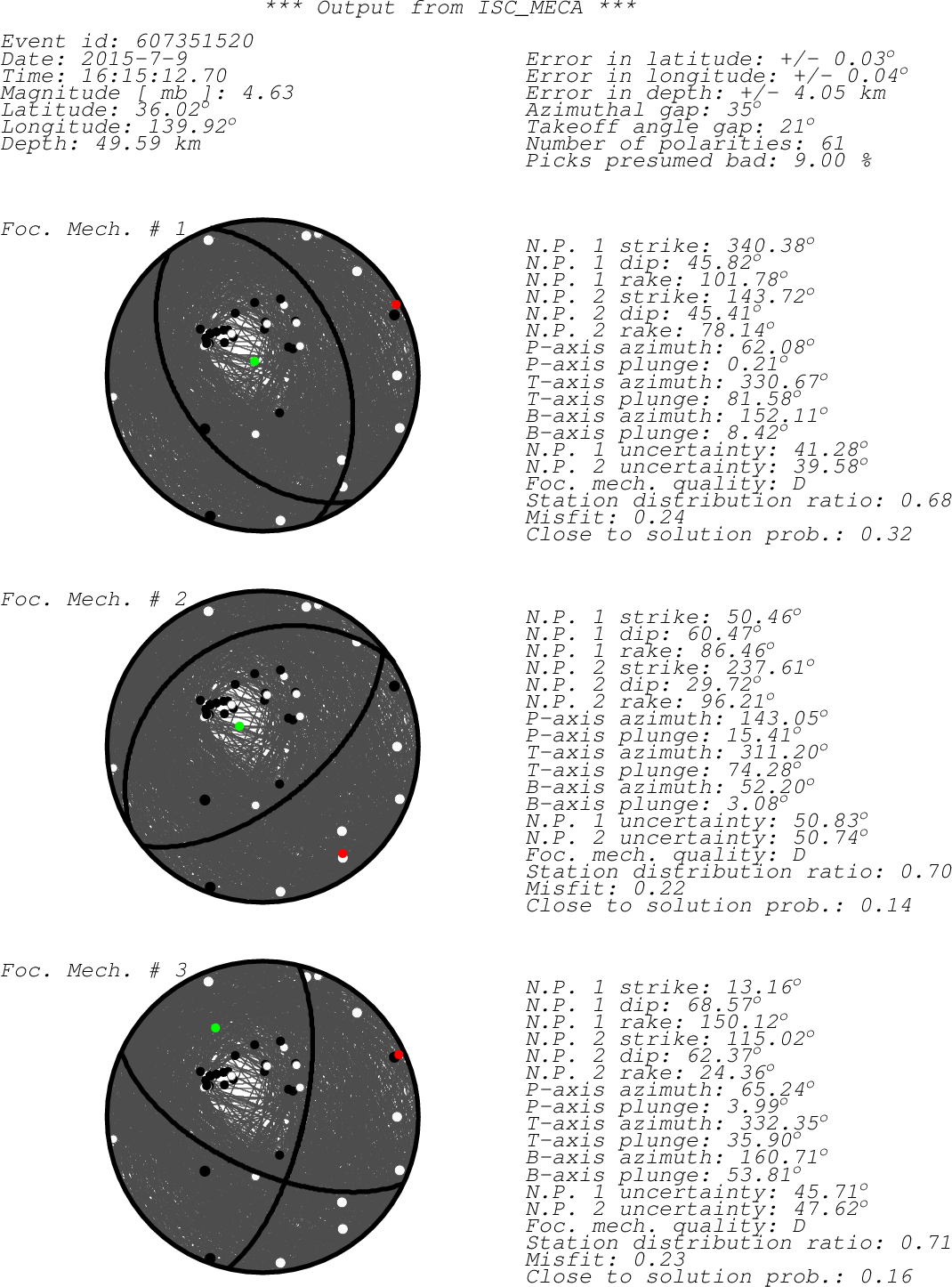 Black dots -> compressions (C,c,+,U,u) White dots -> dilatations (D,d,-) Green dot -> T-axis Red dot -> P-axis