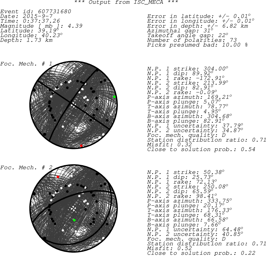 sta chan net loc pol a/m azi dist author irsta YEDI BHZ KO -- + a 44.39 0.34 ISC YEDI ERZN BHZ KO -- - a 314.96 0.56 ISC ERZN KOVA H?Z IR C 214.20 0.59 AFAD KOVA SLHN H?Z IR C 110.64 0.66 AFAD SLHN EUZM H?Z IR D 321.25 0.66 AFAD EUZM HANI H?Z IR D 170.49 0.79 AFAD HANI KOPT H?Z IR C 13.77 0.85 AFAD KOPT VRTB H?Z IR C 91.54 0.95 AFAD VRTB EMRE H?Z IR C 34.18 1.01 AFAD EMRE EJDE H?Z IR C 51.91 1.05 AFAD EJDE BAYB H?Z IR D 0.97 1.06 AFAD BAYB MUSM H?Z IR C 114.74 1.10 AFAD MUSM ERZM H?Z IR C 50.51 1.13 AFAD ERZM REFA H?Z IR C 280.59 1.16 AFAD REFA ELZG H?Z IR C 234.99 1.20 AFAD ELZG BAYT BHZ KO -- - a 356.62 1.20 ISC BAYT KELT H?Z IR D 321.98 1.22 AFAD KELT DIYA H?Z IR D 184.04 1.27 AFAD DIYA KEMA H?Z IR C 273.79 1.35 AFAD KEMA ARPR BHZ GE -- + a 266.75 1.48 ISC ARPR ARPR SHZ GE -- + a 266.75 1.48 ISC ARPR KOPR HHZ KO -- + a 56.95 1.48 ISC KOPR HOMI H?Z IR C 56.05 1.55 AFAD HOMI ALUC H?Z IR D 316.02 1.61 AFAD ALUC BLIS H?Z IR C 117.26 1.66 AFAD BLIS MAZI BHZ KO -- - a 174.41 1.74 ISC MAZI MACK H?Z IR D 348.61 1.79 AFAD MACK SRTM H?Z IR C 131.66 1.79 AFAD SRTM HEKM H?Z IR C 260.70 1.80 AFAD HEKM KTUT ??? IR d 348.84 1.83 BUC KTUT KTUT BHZ KO -- - a 348.84 1.83 ISC KTUT SUSE H?Z IR C 303.57 1.87 AFAD SUSE MARD H?Z IR D 166.94 1.92 AFAD MARD ADCV H?Z IR C 100.40 1.98 AFAD ADCV MIDY H?Z IR D 152.44 2.00 AFAD MIDY AKCD H?Z IR C 244.37 2.02 AFAD AKCD CUZAR H?Z IR C 290.82 2.03 AFAD CUZAR DBAD H?Z IR C 31.09 2.14 AFAD DBAD CUKAN H?Z IR C 274.17 2.15 AFAD CUKAN PERV H?Z IR C 123.80 2.20 AFAD PERV SANL H?Z IR D 206.31 2.24 AFAD SANL DBOC H?Z IR C 26.55 2.41 AFAD DBOC BCA ??? IR c 24.81 2.49 BUC BCA BCA BHZ KO -- + a 24.81 2.49 ISC BCA SARI BHZ KO -- + a 256.47 3.08 ISC SARI KMRS BHZ KO -- + a 238.32 3.12 ISC KMRS AKH ??? IR c 47.33 3.33 BUC AKH GNI B?Z IR C 73.21 3.61 MOS GNI CHVG ??? IR c 21.09 3.79 BUC CHVG CHVG S?Z IR C 21.09 3.79 MOS CHVG TAHT BHZ KO -- + a 230.01 4.26 ISC TAHT ARXR B?Z IR C 9.83 4.44 MOS ARXR NEY S?Z IR D 24.04 4.47 MOS NEY LZRR B?Z IR D 352.58 4.78 MOS LZRR SHA1 B?Z IR D 21.06 4.89 MOS SHA1 KBZ B?Z IR D 22.96 4.95 MOS KBZ NCK B?Z IR D 29.39 4.99 MOS NCK KIV ??? IR c 20.34 5.10 BUC KIV KIV BHZ II 10 + a 20.34 5.10 ISC KIV BR131 B?Z IR C 278.04 5.13 MOS BR131 ANN S?Z IR C 340.49 5.98 MOS ANN GOF S?Z IR C 18.69 6.22 MOS GOF MILM ??? IR c 316.48 11.37 BUC MILM SORM ??? IR d 320.01 12.39 BUC SORM SORM S?Z IR C 320.01 12.39 MOS SORM VOIR ??? IR d 303.95 12.85 BUC VOIR VTS ??? IR d 290.34 13.31 BUC VTS BURAR ??? IR d 312.56 13.77 BUC BURAR AKBB S?Z IR D 329.59 13.88 MOS AKBB BELG B?Z IR D 18.80 14.16 MOS BELG GZR ??? IR c 301.27 14.32 BUC GZR HERR ??? IR c 298.99 14.40 BUC HERR MDVR ??? IR d 298.05 14.85 BUC MDVR DRGR ??? IR c 306.35 14.88 BUC DRGR DRGR S?Z IR C 306.35 14.88 MOS DRGR BZS ??? IR d 301.06 15.16 BUC BZS ARU B?Z IR D 29.07 21.07 MOS ARU ARU SHZ II 00 - a 29.07 21.07 ISC ARU ARU BHZ II 00 - a 29.07 21.07 ISC ARU VSU S?Z IR C 340.13 21.16 MOS VSU SVE S?Z IR D 30.54 22.16 MOS SVE AAK B?Z IR D 71.30 26.01 MOS AAK DGZ S?Z IR D 56.67 34.77 MOS DGZ NRIK S?Z IR D 24.40 39.16 MOS NRIK ULN B?Z IR D 56.63 47.83 MOS ULN CMAR B?Z IR C 94.63 54.47 MOS CMAR sta - Station code (FDSN) chan - channel code net - Network code (FDSN) loc - Location code (FDSN) pol - Polarity a/m - Automatic or manual pick azi - Event to station azimuth (in degrees) dist - Event to station distance (in degrees) author - Author of the polarity irsta - International registry station code