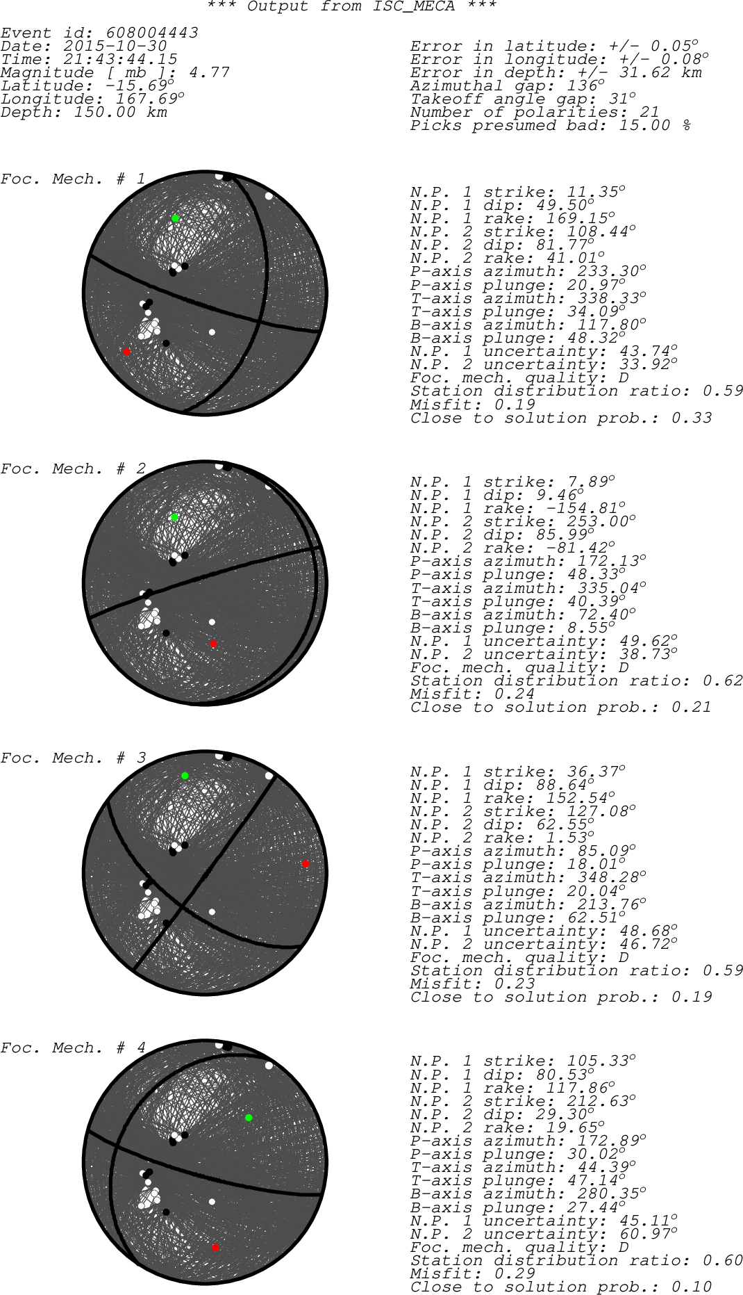 sta chan net loc pol a/m azi dist author irsta KOUNC BHZ ND 00 - a 213.32 5.81 ISC KOUNC DZM BHZ G 00 + a 190.34 6.45 ISC DZM NOUC BHZ G 00 + a 191.40 6.50 ISC NOUC OUENC HHZ ND 00 - a 186.70 6.74 ISC OUENC RMQ SHZ AU -- - a 235.56 20.65 ISC RMQ MTSU SHZ AU -- - a 260.44 22.49 ISC MTSU MGCD SHZ AU -- + a 217.74 23.01 ISC MGCD STKA BHZ AU -- - a 231.21 28.69 ISC STKA WRAB BHZ II 00 + a 257.45 31.98 ISC WRAB AS31 BHZ AU -- - a 250.60 32.72 ISC AS31 BBOO BHZ AU -- - a 233.51 33.32 ISC BBOO MULG BHZ AU -- - a 238.84 34.04 ISC MULG FORT BHZ AU -- - a 240.37 39.16 ISC FORT FITZ BHZ AU -- + a 260.41 40.25 ISC FITZ WHN ??? IR d 312.11 68.89 BJI WHN BYRD BHZ YT -- - a 169.88 71.68 ISC BYA GYA ??? IR c 304.73 72.59 BJI GYA KMI ??? IR c 301.83 75.16 BJI KMI LZH ??? IR d 312.27 79.27 BJI LZH ULN BHZ IU 00 + a 323.77 83.15 ISC ULN ULN BHZ IU 10 + a 323.77 83.15 ISC ULN sta - Station code (FDSN) chan - channel code net - Network code (FDSN) loc - Location code (FDSN) pol - Polarity a/m - Automatic or manual pick azi - Event to station azimuth (in degrees) dist - Event to station distance (in degrees) author - Author of the polarity irsta - International registry station code