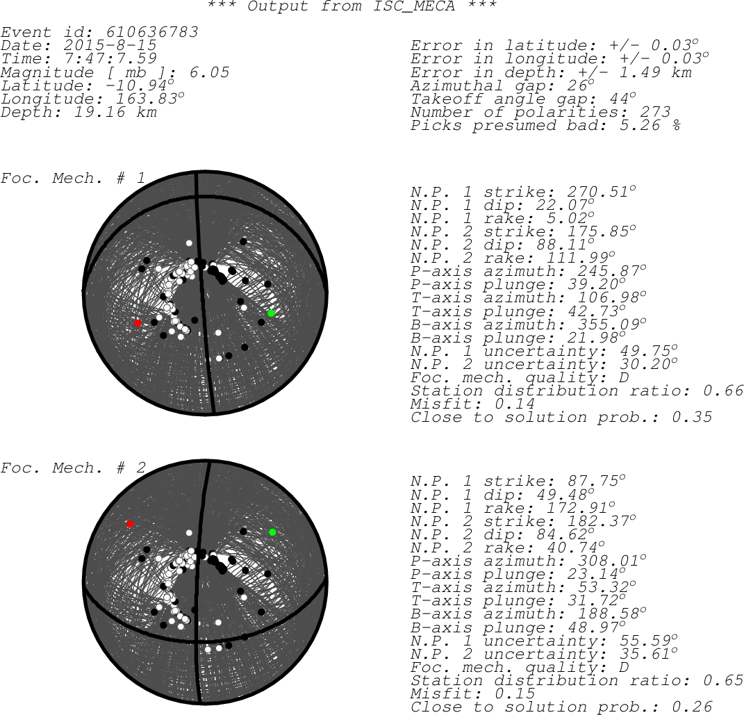 Black dots -> compressions (C,c,+,U,u) White dots -> dilatations (D,d,-) Green dot -> T-axis Red dot -> P-axis