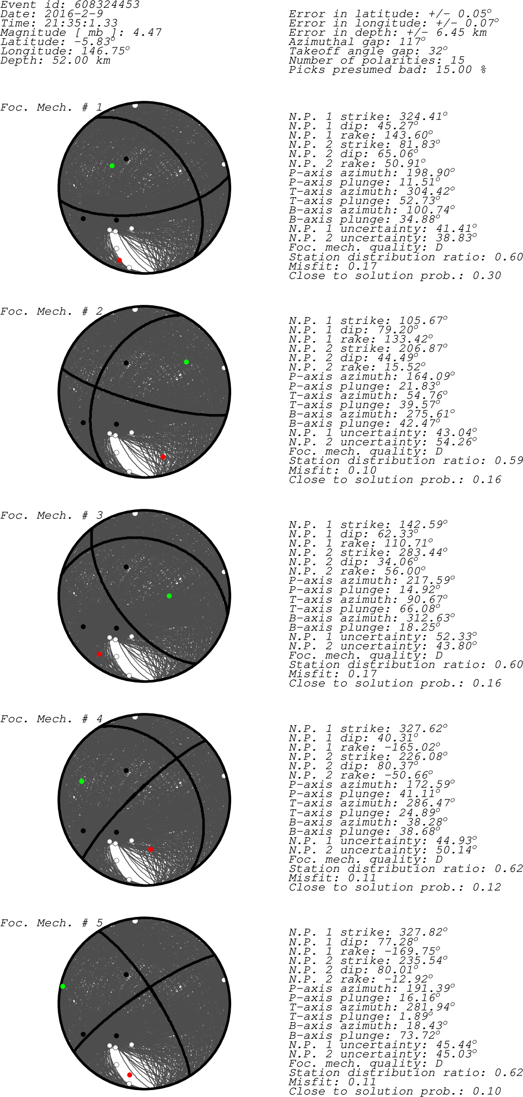 sta chan net loc pol a/m azi dist author irsta PMG BHZ IU 00 - a 173.49 3.58 ISC PMG PMG BHZ IU 60 - a 173.49 3.58 ISC PMG PMG HHZ IU 10 - a 173.49 3.58 ISC PMG PMG BHZ IU 10 - a 173.49 3.58 ISC PMG RABL BHZ AU -- - a 73.48 5.63 ISC RABL MTSU SHZ AU -- - a 190.75 12.47 ISC MTSU KDU BHZ AU -- + a 243.17 15.64 ISC KDU QIS BHZ AU -- - a 204.69 16.20 ISC QIS WRAB BHZ II 10 - a 219.54 18.48 ISC WRAB WRAB BHZ II 00 - a 219.54 18.48 ISC WRAB AS07 SHZ AU -- - a 213.46 21.58 ISC AS07 AS19 SHZ AU -- - a 213.41 21.62 ISC AS19 LCRK BHZ AU -- - a 197.14 25.77 ISC LCRK WRKA BHZ AU -- + a 220.86 26.03 ISC WRKA HNS ??? IR c 327.76 52.37 BJI HNS sta - Station code (FDSN) chan - channel code net - Network code (FDSN) loc - Location code (FDSN) pol - Polarity a/m - Automatic or manual pick azi - Event to station azimuth (in degrees) dist - Event to station distance (in degrees) author - Author of the polarity irsta - International registry station code