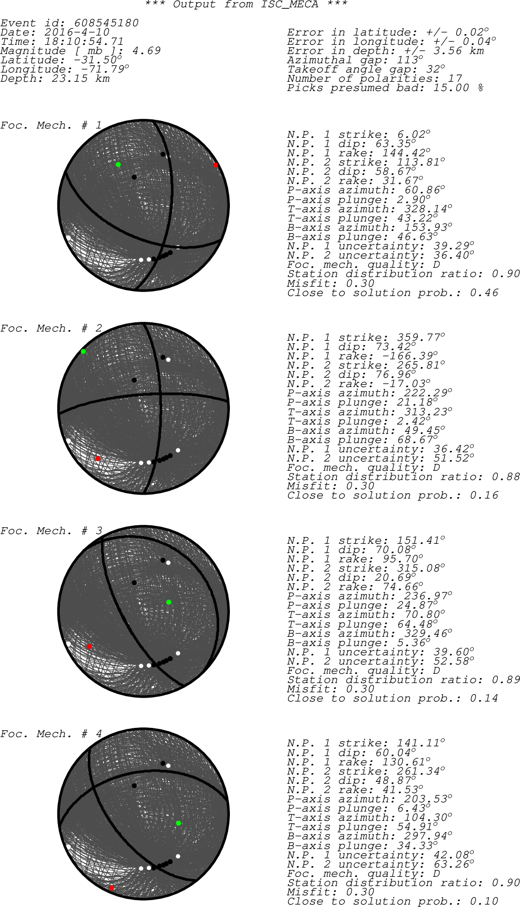 sta chan net loc pol a/m azi dist author irsta CO02 H?Z IR D 66.46 0.74 GUC CO02 CO02 HHZ C1 -- - a 66.45 0.74 ISC CO02 CO06 H?Z IR D 9.17 0.84 GUC CO06 VA06 H?Z IR D 158.52 1.14 GUC VA06 CO03 H?Z IR D 55.27 1.15 GUC CO03 GO04 B?Z IR C 32.99 1.57 GUC GO04 ROCH H?Z IR D 155.97 1.61 GUC ROCH VA03 H?Z IR D 140.45 1.64 GUC VA03 VA03 HHZ C1 -- - a 140.45 1.64 ISC VA03 VA03 BHZ C1 -- - a 140.45 1.64 ISC VA03 MT02 BHZ C1 -- + a 162.70 1.84 ISC MT02 PEL B?Z IR C 150.56 1.89 GUC PEL PEL BHZ G 00 + a 150.33 1.89 ISC PEL MT05 H?Z IR C 155.03 2.08 GUC MT05 MT05 BHZ C1 -- + a 155.03 2.08 ISC MT05 FCH B?Z IR C 145.54 2.22 GUC FCH MT03 H?Z IR C 151.78 2.26 GUC MT03 MT09 H?Z IR C 163.62 2.37 GUC MT09 MT01 H?Z IR C 169.23 2.40 GUC MT01 MT01 HHZ C1 -- + a 169.23 2.40 ISC MT01 LCO B?Z IR C 21.05 2.66 GUC LCO BO04 H?Z IR C 158.46 2.67 GUC BO04 BO01 HHZ C1 -- - a 168.57 2.94 ISC BO01 BO01 BHZ C1 -- - a 168.57 2.94 ISC BO01 BO03 HHZ C1 -- - a 182.72 2.99 ISC BO03 BO03 BHZ C1 -- - a 182.72 2.99 ISC BO03 AC02 BHZ C1 -- - a 27.23 5.20 ISC AC02 LC01 BHZ C1 -- + a 174.47 7.42 ISC LC01 PLCA SHZ GT 10 - a 174.14 9.27 ISC PLCA QPSB HHZ OV -- + a 341.76 42.34 ISC QPSR sta - Station code (FDSN) chan - channel code net - Network code (FDSN) loc - Location code (FDSN) pol - Polarity a/m - Automatic or manual pick azi - Event to station azimuth (in degrees) dist - Event to station distance (in degrees) author - Author of the polarity irsta - International registry station code