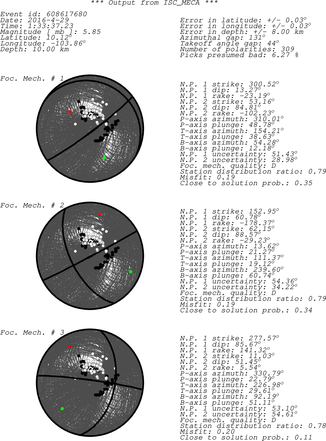 Black dots -> compressions (C,c,+,U,u) White dots -> dilatations (D,d,-) Green dot -> T-axis Red dot -> P-axis