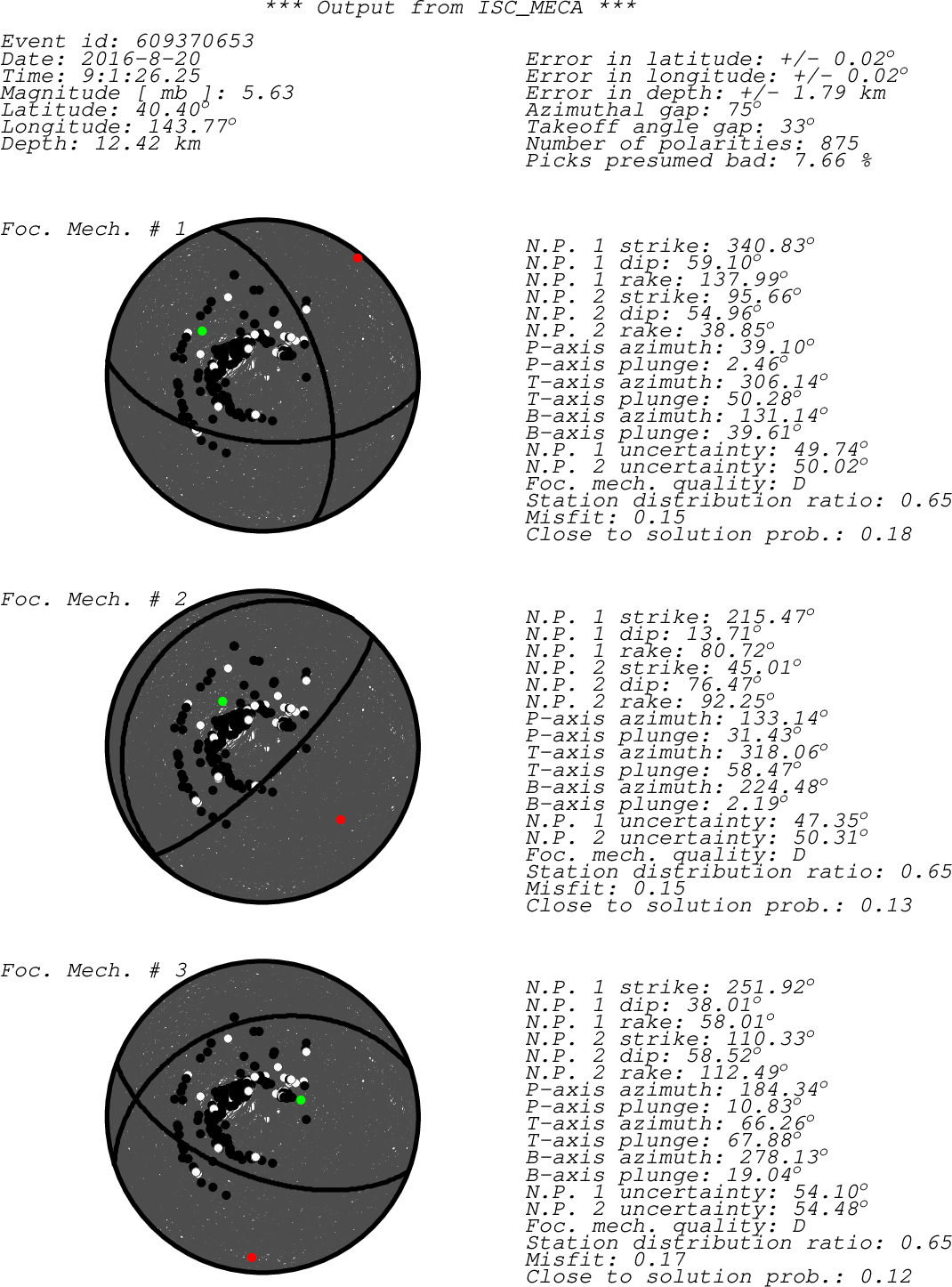 Black dots -> compressions (C,c,+,U,u) White dots -> dilatations (D,d,-) Green dot -> T-axis Red dot -> P-axis