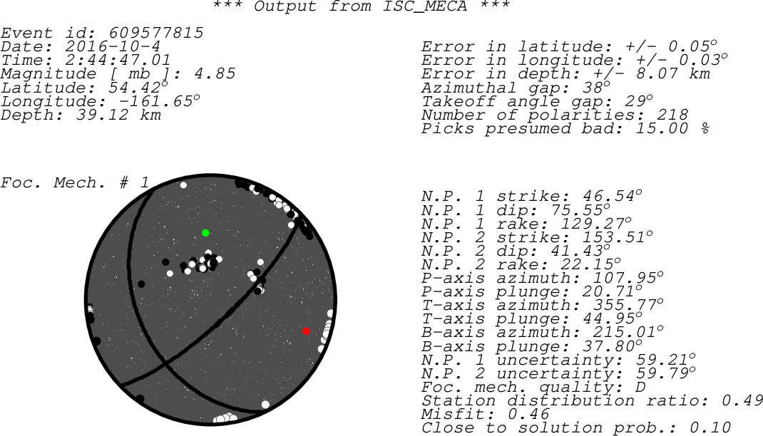Black dots -> compressions (C,c,+,U,u) White dots -> dilatations (D,d,-) Green dot -> T-axis Red dot -> P-axis