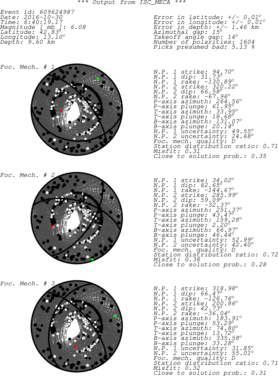 Black dots -> compressions (C,c,+,U,u) White dots -> dilatations (D,d,-) Green dot -> T-axis Red dot -> P-axis