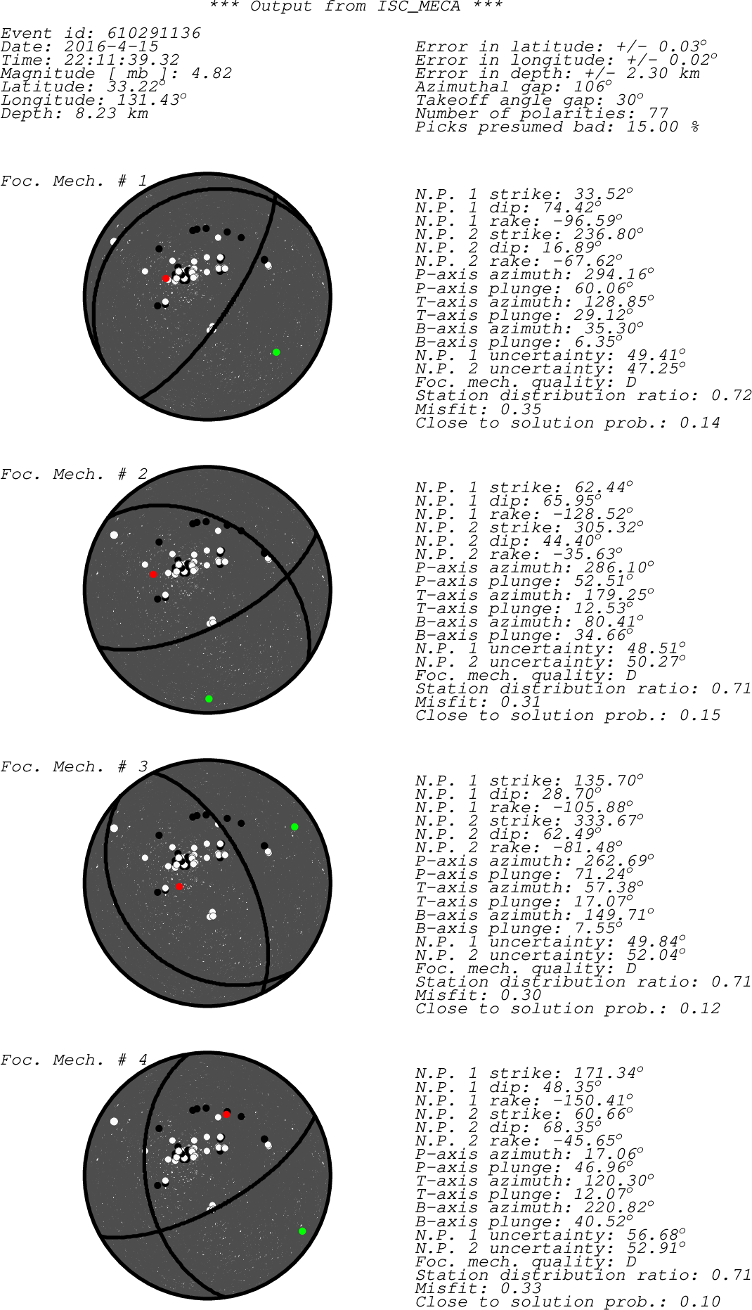 Black dots -> compressions (C,c,+,U,u) White dots -> dilatations (D,d,-) Green dot -> T-axis Red dot -> P-axis