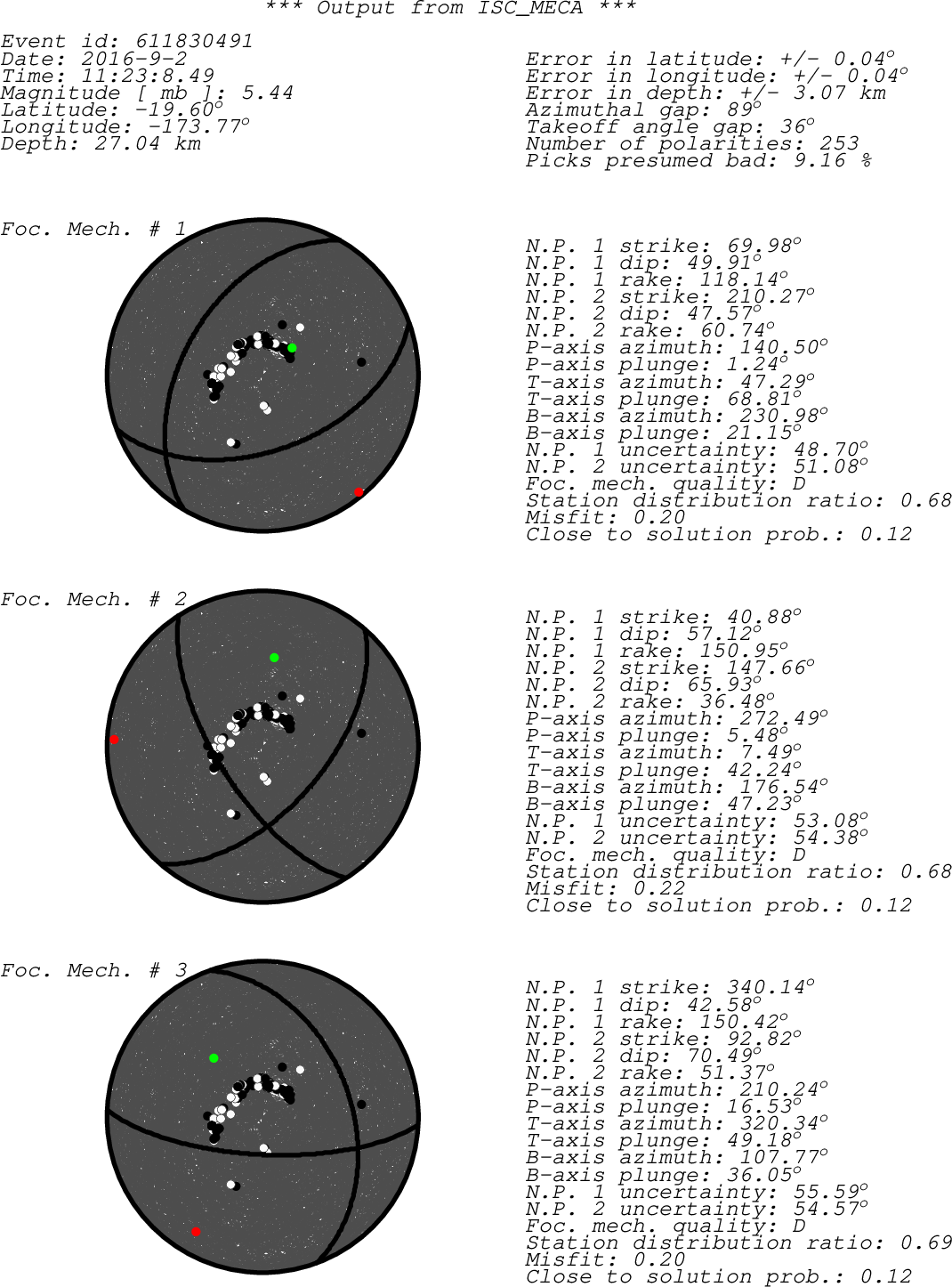 Black dots -> compressions (C,c,+,U,u) White dots -> dilatations (D,d,-) Green dot -> T-axis Red dot -> P-axis