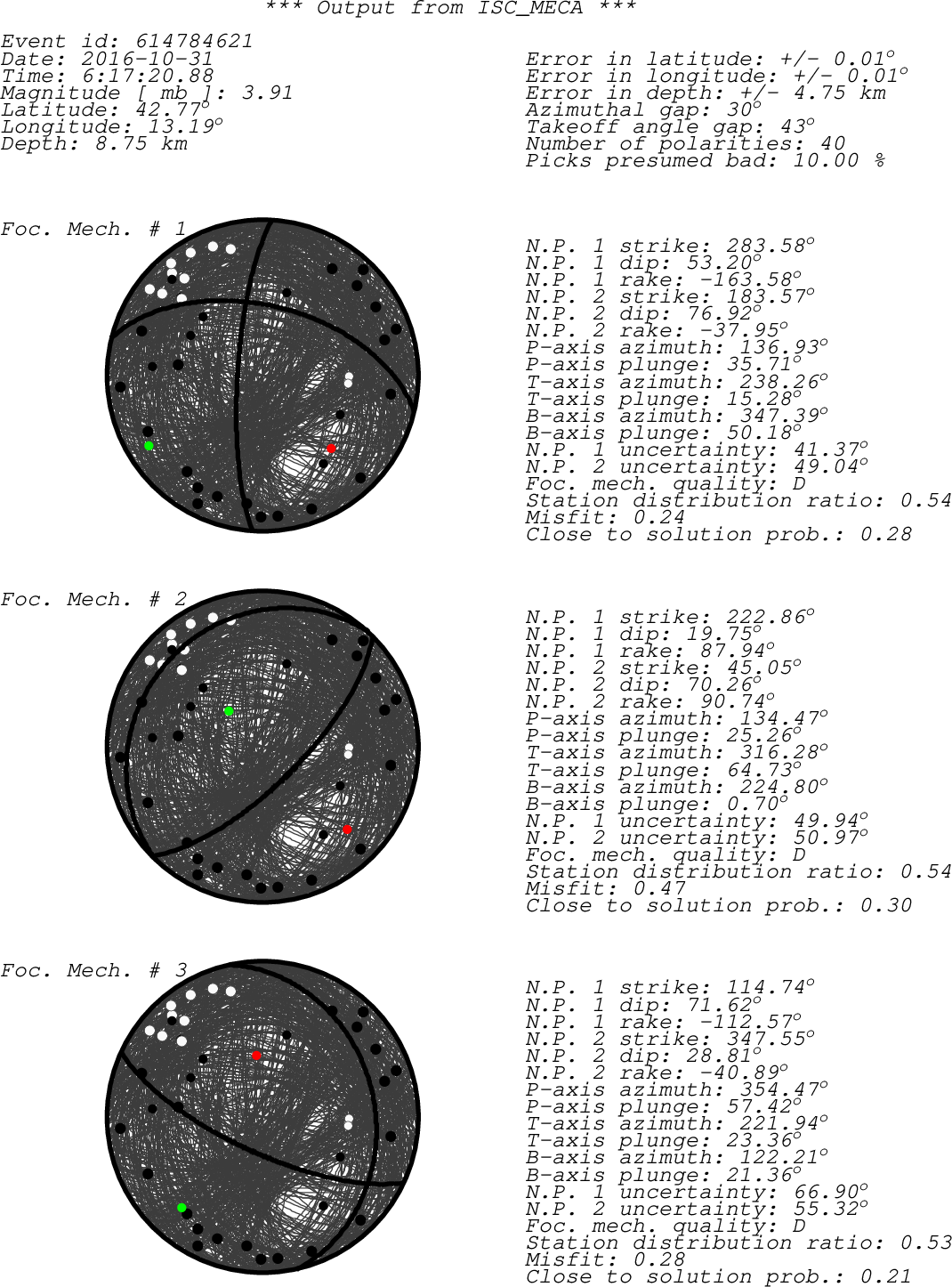 sta chan net loc pol a/m azi dist author irsta T1244 HNZ IR + m 97.00 0.08 ROM T1244 T1204 EHZ IR - m 133.43 0.13 ROM T1204 MMO1 HNZ IR + m 37.99 0.17 ROM MMO1 SMA1 EHZ IR - m 141.14 0.17 ROM SMA1 LNSS HHZ IR + m 213.31 0.20 ROM LNSS T1217 EHZ IR + m 253.71 0.20 ROM T1217 T1241 HNZ IR + m 63.60 0.20 ROM T1241 T1243 HNZ IR + m 109.97 0.21 ROM T1243 T1215 EHZ IR + m 278.55 0.24 ROM T1215 T1256 HNZ IR + m 6.95 0.24 ROM T1256 AM05 EHZ IR + m 30.16 0.24 ROM AM05 T1246 HHZ IR - m 128.99 0.29 ROM T1246 GUMA HHZ IR + m 20.27 0.32 ROM GUMA T1247 HHZ IR - m 165.70 0.34 ROM T1247 T1211 EHZ IR + m 226.34 0.34 ROM T1211 ARRO EHZ IR + m 238.95 0.36 ROM ARRO GIGS HHZ IR - m 138.16 0.42 ROM GIGS AQU HHZ IR - m 158.83 0.44 ROM AQU CESX HHZ IR + m 250.85 0.47 ROM CESX SNTG HHZ IR + m 339.80 0.52 ROM SNTG TRTR HHZ IR + m 85.38 0.54 ROM TRTR EL6 EHZ IR + m 353.73 0.56 ROM EL6 ATCC EHZ IR + m 316.36 0.58 ROM ATCC FAGN HHZ IR - m 149.45 0.58 ROM FAGN CING HHZ IR + m 0.62 0.61 ROM CING VCEL EHZ IR - m 127.39 0.61 ROM VCEL PP3 EHZ IR + m 26.79 0.69 ROM PP3 T0110 HHZ IR - m 140.75 0.70 ROM T0110 SRES HHZ IR + m 223.58 0.73 ROM SRES MTCE HHZ IR + m 204.01 0.81 ROM MTCE FRON EHZ IR + m 335.96 0.82 ROM FRON SSP9 EHZ IR + m 316.62 1.12 ROM SSP9 CRE HHZ IR + m 313.75 1.24 ROM CRE ARCI HHZ IR + m 274.43 1.26 ROM ARCI RNI2 HHZ IR + m 145.68 1.28 ROM RNI2 OSSC HNE IR + m 298.69 1.61 ROM OSSC SEI HHZ IR + m 314.60 1.85 ROM SEI SGRT HHZ IR + m 117.20 2.15 ROM SGRT CEY ??? IR c 16.27 3.10 RHSSO CEY CEME ??? IR D 91.05 4.23 PDG CEME BUM ??? IR D 94.38 4.24 PDG BUM DRME ??? IR D 95.42 4.47 PDG DRME sta - Station code (FDSN) chan - channel code net - Network code (FDSN) loc - Location code (FDSN) pol - Polarity a/m - Automatic or manual pick azi - Event to station azimuth (in degrees) dist - Event to station distance (in degrees) author - Author of the polarity irsta - International registry station code