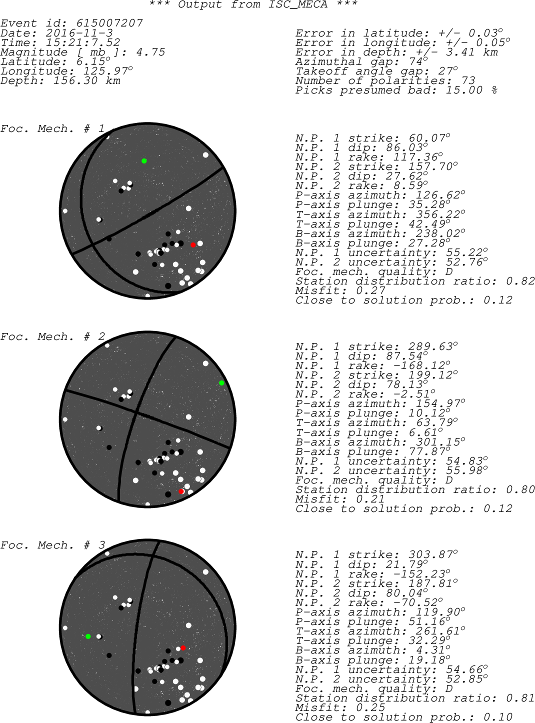 Black dots -> compressions (C,c,+,U,u) White dots -> dilatations (D,d,-) Green dot -> T-axis Red dot -> P-axis