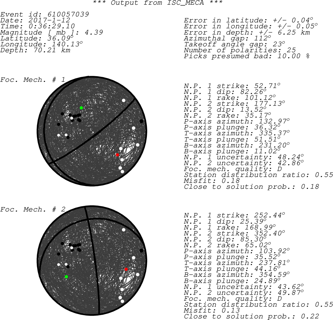 Black dots -> compressions (C,c,+,U,u) White dots -> dilatations (D,d,-) Green dot -> T-axis Red dot -> P-axis