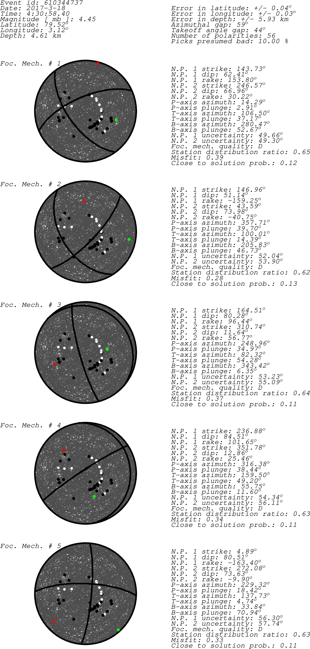 sta chan net loc pol a/m azi dist author irsta KBS B?Z IR C 105.37 1.76 MOS KBS KBS B?Z IR C 105.37 1.76 BER KBS KBS BHZ GE 10 + a 105.69 1.77 ISC KBS KBS HHZ IU 10 + a 105.69 1.77 ISC KBS KBS BHZ IU 10 + a 105.69 1.77 ISC KBS SPB4 HHZ NO 00 + a 111.02 2.90 ISC SPB4 SPB5 HHZ NO 00 + a 110.92 2.90 ISC SPB5 SPA0 ??? IR c 110.99 2.90 IEPN SPA0 SPB3 HHZ NO 00 + a 111.09 2.90 ISC SPB3 SPA0 HHZ NO 00 + a 110.99 2.90 ISC SPITS SPB1 HHZ NO 00 + a 110.92 2.90 ISC SPB1 HSPB HHZ PL -- + a 128.69 3.57 ISC HSPB NOR BHZ DK -- + a 312.25 3.85 ISC NOR DAG BHZ GE -- + a 249.43 5.24 ISC DAG DAG BHZ DK -- + a 249.43 5.24 ISC DAG BJO1 HHZ NS 00 - a 136.63 6.15 ISC BJO1 JMIC HHZ NO 00 + a 204.85 9.04 ISC JMIC SUMG BHZ GE -- + a 256.79 11.85 ISC SUMG KULLO HHZ DK -- - a 281.26 13.71 ISC KULLO TULEG BHZ DK -- + a 295.58 14.30 ISC TULEG RNF BHZ FN -- + a 141.28 14.38 ISC RNF APA S?Z IR D 129.00 14.42 MOS APA ICESG BHZ DK 00 + a 250.12 15.02 ISC ICESG DY2G BHZ DK 00 + a 253.75 18.52 ISC DY2G CLRN BHZ CN -- - a 282.15 19.06 ISC CLRN RES BHZ CN -- + a 308.99 19.79 ISC RES ARBE BHZ EE -- + a 146.98 21.37 ISC ARBE VSU S?Z IR D 146.47 22.40 MOS VSU KIRV S?Z IR C 117.82 25.35 MOS KIRV OBN S?Z IR C 135.42 26.82 MOS OBN ARU B?Z IR D 109.00 28.94 MOS ARU MORC ??? IR c 161.33 30.29 BUC MORC AKBB S?Z IR C 146.33 30.31 MOS AKBB VRAC ??? IR c 162.62 30.70 BUC VRAC KHC S?Z IR C 166.51 30.73 MOS KHC BELG S?Z IR D 123.56 31.03 MOS BELG TRPA ??? IR c 155.34 32.27 BUC TRPA BILL S?Z IR C 11.76 32.33 MOS BILL BURAR ??? IR c 152.14 33.00 BUC BURAR MORH ??? IR c 160.54 33.91 BUC MORH SURR ??? IR d 156.33 34.60 BUC SURR BZS ??? IR d 156.97 34.70 BUC BZS GZR ??? IR c 155.60 35.01 BUC GZR YAK S?Z IR D 40.87 35.36 MOS YAK MDVR ??? IR c 157.00 35.54 BUC MDVR SEY S?Z IR D 23.05 36.66 MOS SEY KUR06 BHZ KZ -- + a 91.56 38.09 ISC KUR06 KUR07 BHZ KZ -- + a 91.57 38.11 ISC KUR07 KBZ S?Z IR C 132.27 38.81 MOS KBZ DGZ S?Z IR D 83.29 40.58 MOS DGZ BR131 B?Z IR C 143.88 41.63 MOS BR131 MK31 B?Z IR D 89.48 42.44 MOS MK31 MKAR BHZ KZ -- - a 89.48 42.44 ISC MKAR ZEA S?Z IR D 45.99 43.13 MOS ZEA ULN S?Z IR D 65.72 45.80 MOS ULN ECSD BHZ US 10 - a 289.05 49.10 ISC ECSD MBAR B?Z IR C 152.03 81.26 MOS MBAR sta - Station code (FDSN) chan - channel code net - Network code (FDSN) loc - Location code (FDSN) pol - Polarity a/m - Automatic or manual pick azi - Event to station azimuth (in degrees) dist - Event to station distance (in degrees) author - Author of the polarity irsta - International registry station code