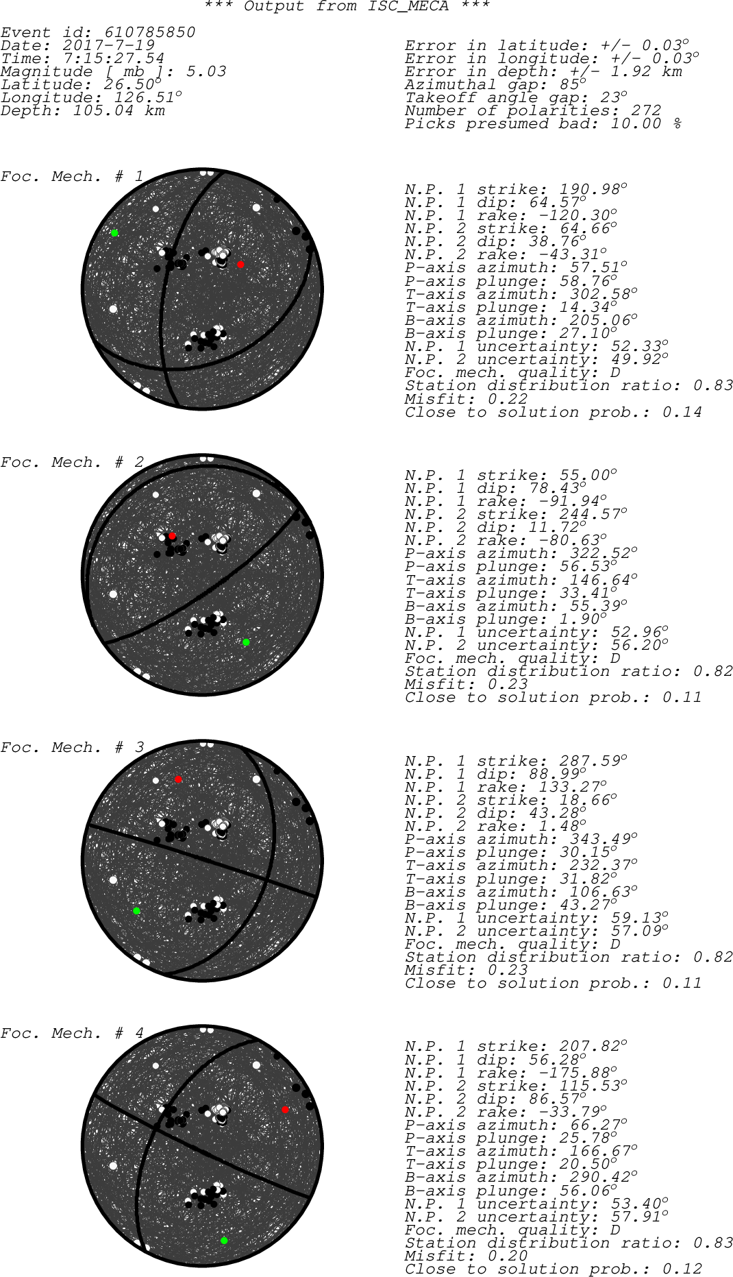 Black dots -> compressions (C,c,+,U,u) White dots -> dilatations (D,d,-) Green dot -> T-axis Red dot -> P-axis