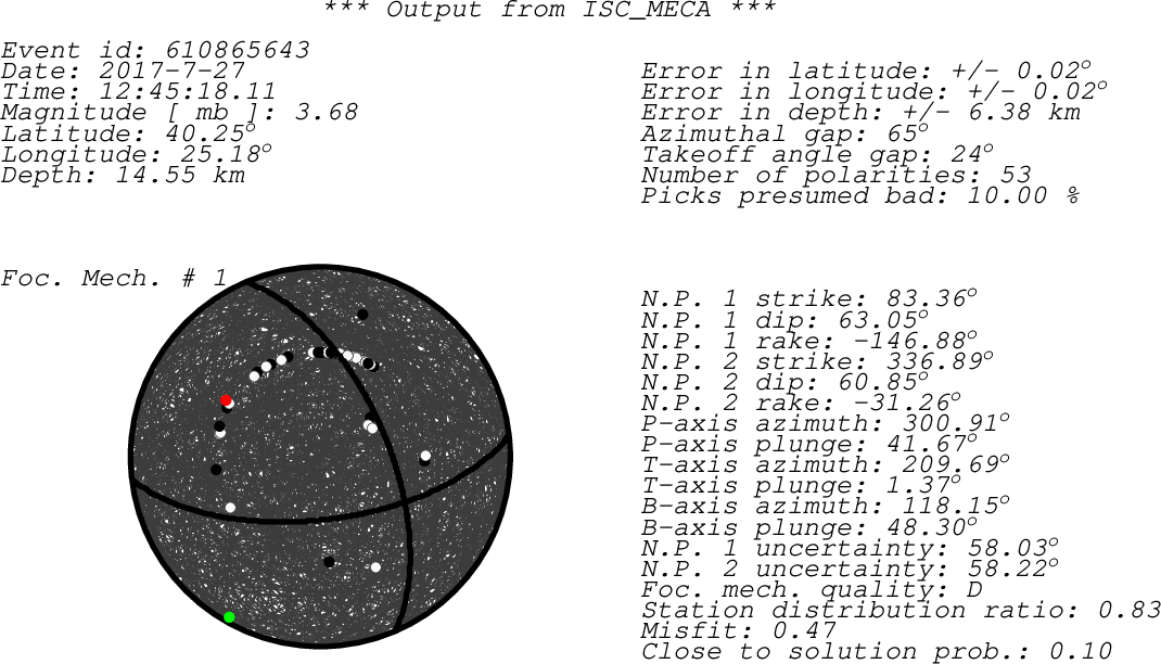 sta chan net loc pol a/m azi dist author irsta RDO HHZ HL -- + a 16.52 0.93 ISC RDO SIGR HHZ HT -- + a 153.24 1.16 ISC SIGR SIGR BHZ HT -- - a 153.24 1.16 ISC SIGR HORT BHZ HT -- - a 283.02 1.63 ISC HORT HORT HHZ HT -- - a 283.02 1.63 ISC HORT THE BHZ HT -- - a 283.43 1.74 ISC THE XOR BHZ HT -- - a 240.75 1.77 ISC XOR VTS ??? IR c 328.88 2.78 BUC VTS VTS BHZ MN -- - a 328.88 2.78 ISC VTS APE ??? IR c 175.00 3.19 BUC APE APE B?Z IR C 175.00 3.19 MOS APE LOZB ??? IR c 18.20 3.29 BUC LOZB RAZG ??? IR c 16.16 3.46 BUC RAZG CAVI HHZ KO -- - a 89.26 3.56 ISC CAVI TIR BHZ MN -- + a 286.91 4.18 ISC TIR BOVS ??? IR c 323.66 4.26 BUC BOVS ICOR ??? IR d 25.85 4.33 BUC ICOR BCI HHZ AC -- - a 300.43 4.40 ISC BCI MFTR ??? IR c 30.43 4.60 BUC MFTR TIRR ??? IR d 28.57 4.84 BUC TIRR HARR ??? IR d 23.69 4.88 BUC HARR PDG ??? IR c 297.95 4.97 BUC PDG ARR ??? IR d 355.66 5.13 BUC ARR VOIR ??? IR c 358.95 5.19 BUC VOIR MDVR ??? IR c 331.62 5.21 BUC MDVR MDVR BHZ RO -- + a 331.62 5.21 ISC MDVR MLR ??? IR c 5.84 5.27 BUC MLR MLR HHZ RO -- - a 5.84 5.27 ISC MLR MLR EHZ RO -- - a 5.84 5.27 ISC MLR MLR BHZ RO -- + a 5.84 5.27 ISC MLR CFR ??? IR c 22.84 5.38 BUC CFR BISRR ??? IR c 11.44 5.41 BUC BISRR GZR ??? IR c 341.80 5.44 BUC GZR TLCR ??? IR c 27.26 5.61 BUC TLCR PLOR ??? IR c 10.37 5.70 BUC PLOR DOPR ??? IR c 1.43 5.72 BUC DOPR VRI ??? IR d 10.88 5.73 BUC VRI OZUR ??? IR d 4.11 5.86 BUC OZUR VARL ??? IR d 18.17 5.97 BUC VARL VLDR ??? IR d 19.82 5.98 BUC VLDR TESR ??? IR c 9.19 6.35 BUC TESR BR131 B?Z IR C 91.89 6.51 MOS BR131 SIRR ??? IR d 338.02 6.54 BUC SIRR TIP ??? IR c 263.36 6.58 BUC TIP BIZ ??? IR d 5.40 6.72 BUC BIZ BURAR ??? IR c 0.17 7.36 BUC BURAR SORM ??? IR c 15.03 8.21 BUC SORM SORM HHZ MD -- - a 15.03 8.21 ISC SORM SORM BHZ MD -- - a 15.03 8.21 ISC SORM AKBB S?Z IR D 13.80 10.83 MOS AKBB KHC S?Z IR D 320.97 12.11 MOS KHC VSU S?Z IR D 2.60 18.26 MOS VSU BELG B?Z IR C 44.23 19.59 MOS BELG BRVK S?Z IR C 51.83 32.94 MOS BRVK MK31 S?Z IR D 61.29 41.13 MOS MK31 DGZ S?Z IR D 56.01 43.87 MOS DGZ sta - Station code (FDSN) chan - channel code net - Network code (FDSN) loc - Location code (FDSN) pol - Polarity a/m - Automatic or manual pick azi - Event to station azimuth (in degrees) dist - Event to station distance (in degrees) author - Author of the polarity irsta - International registry station code