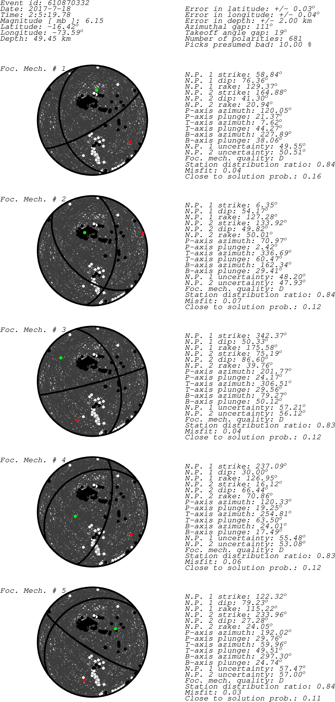 Black dots -> compressions (C,c,+,U,u) White dots -> dilatations (D,d,-) Green dot -> T-axis Red dot -> P-axis