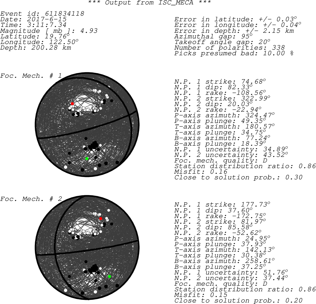 Black dots -> compressions (C,c,+,U,u) White dots -> dilatations (D,d,-) Green dot -> T-axis Red dot -> P-axis