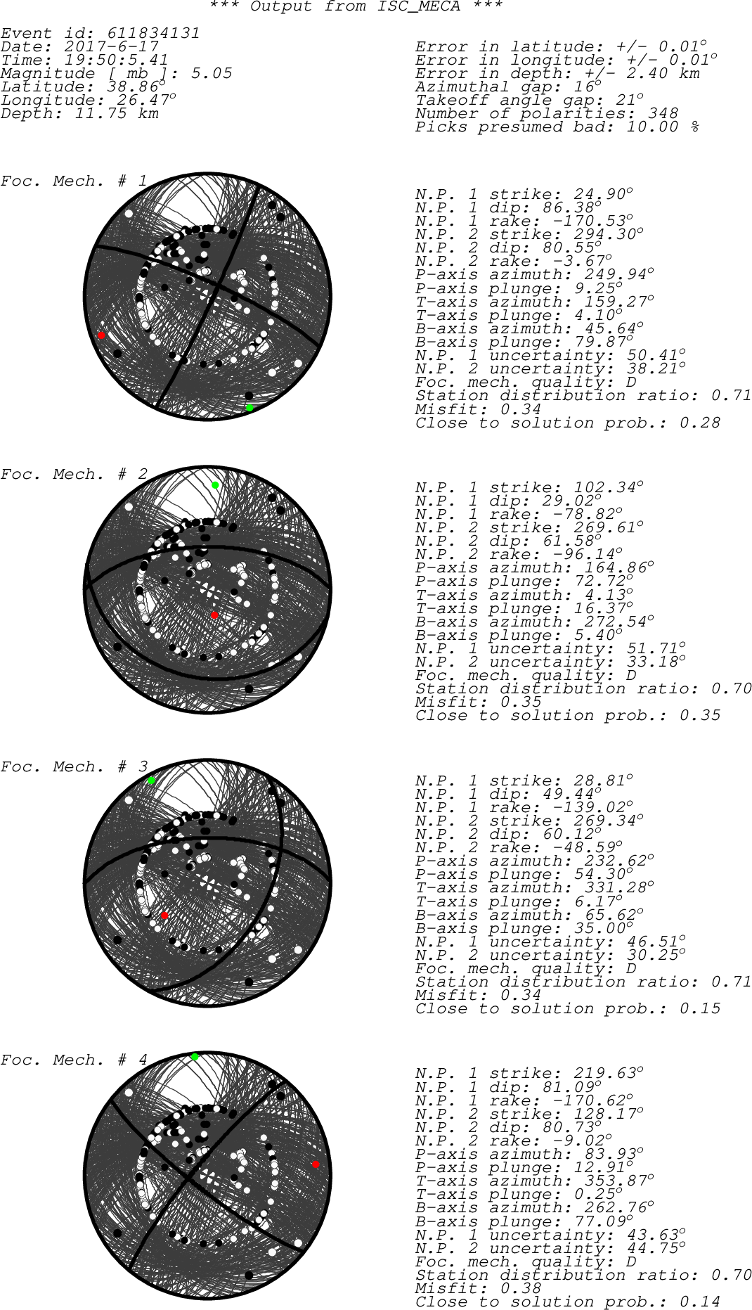 Black dots -> compressions (C,c,+,U,u) White dots -> dilatations (D,d,-) Green dot -> T-axis Red dot -> P-axis