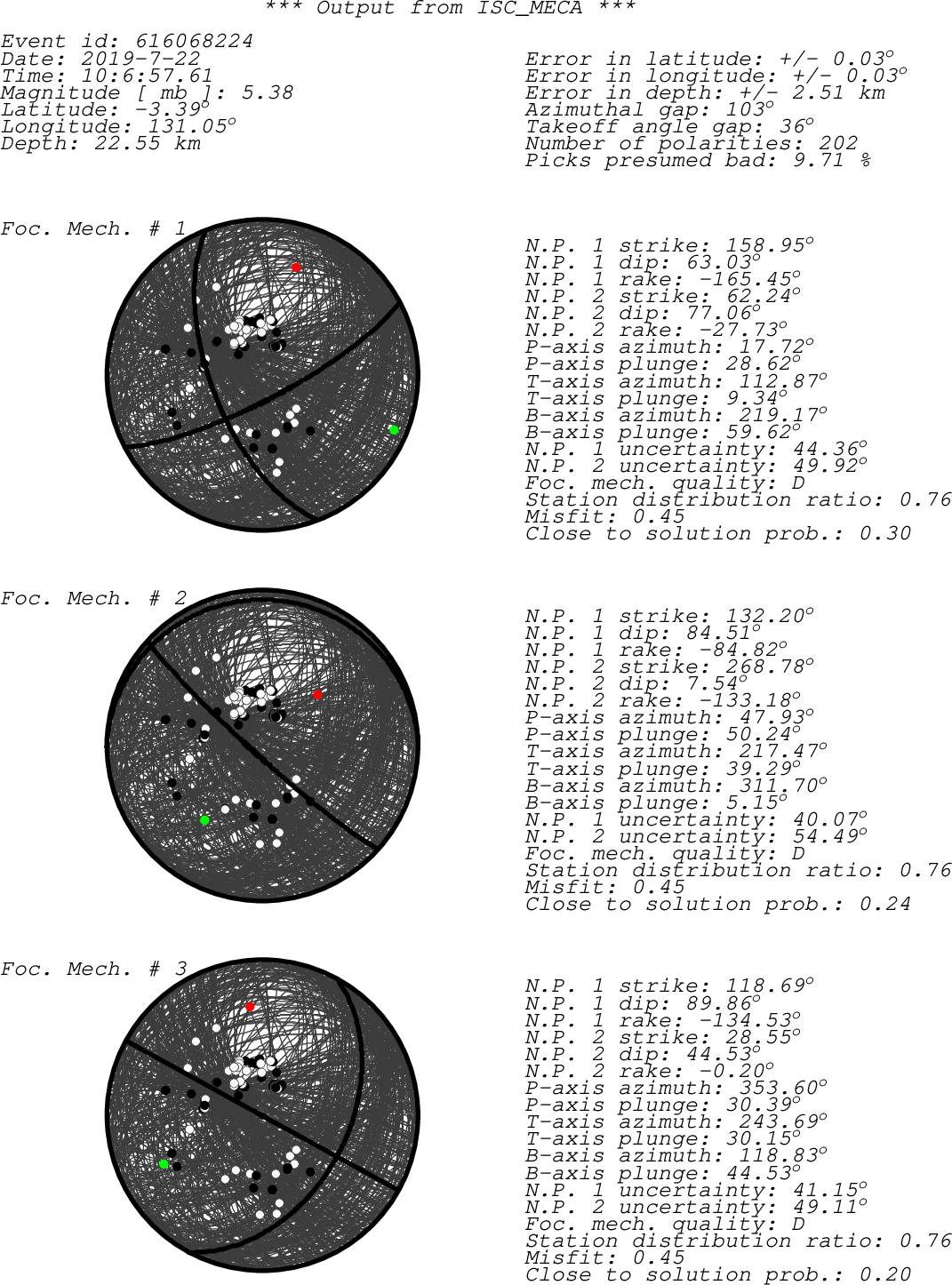 Black dots -> compressions (C,c,+,U,u) White dots -> dilatations (D,d,-) Green dot -> T-axis Red dot -> P-axis