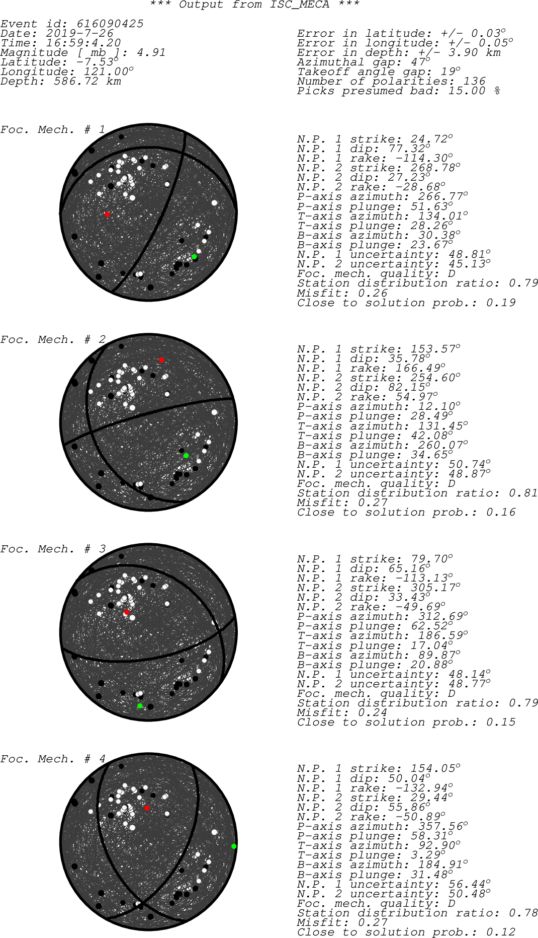 sta chan net loc pol a/m azi dist author irsta MMRI BHZ GE -- - a 132.11 1.64 ISC MMRI SOEI BHZ GE -- + a 124.68 3.91 ISC SOEI JAGI BHZ GE -- - a 261.68 6.85 ISC JAGI SANI BHZ GE -- + a 42.62 7.37 ISC SANI TOLI2 BHZ GE -- + a 358.51 8.58 ISC TOLI2 BNDI BHZ GE -- + a 71.86 9.34 ISC BNDI TNTI BHZ GE -- + a 37.85 10.40 ISC TNTI DPH SHZ AU 00 + a 117.65 10.86 ISC DPH KNRA BHZ AU 00 + a 137.52 11.10 ISC KNRA MTN BHZ AU -- + a 118.74 11.28 ISC MTN KKM BHZ MY -- + a 340.36 14.30 ISC KKM GIRL BHZ AU 00 + a 202.72 16.38 ISC GIRL WB10 BHZ AU -- + a 134.47 17.79 ISC WB0 WB9 BHZ AU -- - a 134.55 17.80 ISC WB9 WB8 BHZ AU -- - a 134.61 17.82 ISC WB8 WB7 BHZ AU -- + a 134.68 17.83 ISC WB7 WB5 BHZ AU -- + a 134.80 17.85 ISC WB5 WB4 BHZ AU -- + a 134.87 17.86 ISC WB4 WC1 BHZ AU -- + a 134.96 17.86 ISC WC1 WC2 BHZ AU -- - a 134.91 17.88 ISC WC2 WB2 BHZ AU -- + a 134.98 17.88 ISC WB2 WRAB BHZ II 10 + a 134.94 17.88 ISC WRAB WC4 BHZ AU -- - a 135.05 17.89 ISC WC4 WB1 BHZ AU -- - a 135.03 17.89 ISC WB1 WR2 BHZ AU -- + a 134.97 17.89 ISC WR2 WC3 BHZ AU -- + a 134.98 17.91 ISC WC3 WR3 BHZ AU -- + a 134.92 17.91 ISC WR3 WR4 BHZ AU -- + a 134.89 17.93 ISC WR4 WR5 BHZ AU -- + a 134.84 17.94 ISC WR5 WR6 BHZ AU -- + a 134.80 17.96 ISC WR6 WR7 BHZ AU -- + a 134.76 17.98 ISC WR7 WR8 BHZ AU -- + a 134.71 17.99 ISC WR8 WR9 BHZ AU -- + a 134.69 18.01 ISC WR9 WR10 BHZ AU -- + a 134.64 18.02 ISC WR0 WRKA BHZ AU 00 + a 159.02 18.75 ISC WRKA MEEK BHZ AU -- + a 186.54 19.14 ISC MEEK KOM BHZ MY -- - a 297.74 19.46 ISC MYKOM AS15 SHZ AU -- + a 143.70 20.25 ISC AS15 AS13 SHZ AU -- + a 143.77 20.25 ISC AS13 AS14 SHZ AU -- + a 143.74 20.26 ISC AS14 AS16 SHZ AU -- + a 143.67 20.26 ISC AS16 AS31 BHZ AU -- + a 143.78 20.27 ISC AS31 AS11 SHZ AU -- + a 143.81 20.27 ISC AS11 AS04 SHZ AU -- + a 143.71 20.28 ISC AS04 AS05 SHZ AU -- + a 143.66 20.28 ISC AS05 AS03 SHZ AU -- + a 143.76 20.28 ISC AS03 AS06 SHZ AU -- + a 143.60 20.29 ISC AS06 AS01 SHZ AU -- + a 143.68 20.29 ISC AS01 AS02 SHZ AU -- + a 143.73 20.30 ISC AS02 AS10 SHZ AU -- + a 143.81 20.30 ISC AS10 AS07 SHZ AU -- + a 143.64 20.30 ISC AS07 AS08 SHZ AU -- + a 143.69 20.31 ISC AS08 AS09 SHZ AU -- + a 143.76 20.31 ISC AS09 AS17 SHZ AU -- + a 143.59 20.32 ISC AS17 AS19 SHZ AU -- + a 143.73 20.33 ISC AS19 MORW BHZ AU -- + a 191.70 21.93 ISC MORW QIS BHZ AU -- - a 127.64 22.18 ISC QIS COEN BHZ AU -- - a 108.22 22.69 ISC COEN BLDU BHZ AU -- + a 189.39 23.32 ISC BLDU KLBR SHZ AU -- + a 186.79 24.13 ISC KLBR MUN BHZ AU -- - a 189.78 24.73 ISC MUN MTSU SHZ AU -- - a 117.19 25.03 ISC MTSU MULG BHZ AU 00 + a 153.26 25.74 ISC MULG CN1H SHZ AU 00 + a 113.44 25.86 ISC CN1H SRIT BHZ TM -- - a 306.50 26.68 ISC SRIT RKGY BHZ AU 00 - a 187.28 27.20 ISC RKGY QIZ BHZ IC 00 - a 337.50 28.59 ISC QIZ BBOO BHZ AU -- + a 152.98 28.78 ISC BBOO YAPP BHZ AU 00 + a 148.63 29.09 ISC YAPP HTT BHZ AU 10 + a 149.69 30.65 ISC HTT SDAN BHZ AU 00 + a 150.39 31.72 ISC SDAN SLV BHZ RM -- - a 329.98 33.23 ISC SLVN CHTO BHZ IU 00 + a 320.53 34.03 ISC CHTO NPW BHZ GE -- - a 318.31 36.55 ISC NPW KMI ??? IR d 331.84 37.01 BJI KMI TNCH ??? IR d 326.61 39.07 BJI TNCH ENH BHZ IC 60 - a 344.14 39.18 ISC ENH NJ2 ??? IR d 357.12 39.41 BJI NJ2 XAN ??? IR d 345.20 42.90 BJI XAN MALK BHZ GE -- - a 290.64 43.32 ISC MALK HNS ??? IR c 352.91 45.08 BJI HNS SANVU BHZ G 00 - a 104.16 45.87 ISC SANVU LSA BHZ IC 00 - a 323.56 46.86 ISC LSA JMM BHZ JP -- - a 20.86 48.79 ISC JMM JTM BHZ JP -- - a 19.44 51.50 ISC JTM BNX ??? IR c 5.58 53.34 BJI BNX ULN BHZ IU 00 - a 348.78 56.51 ISC ULN MWZ HHZ NZ 10 + a 130.28 59.30 ISC MWZ TARG BHZ KC -- - a 324.88 62.95 ISC TARG PDGK BHZ KZ -- + a 327.14 63.08 ISC PDGK PRZ BHZ KR -- - a 325.86 63.12 ISC PRZ ASAI BHZ KC -- - a 323.49 63.18 ISC ASAI KDJ BHZ KR -- - a 324.89 63.56 ISC KDJ MAKZ BHZ KZ -- - a 331.30 64.25 ISC MAKZ SFK BHZ KR -- - a 321.13 64.47 ISC SFK KBL BHZ IU -- - a 313.91 64.48 ISC KBL BOOM BHZ KR -- - a 324.55 64.51 ISC BOOM SALK BHZ KR -- - a 322.06 64.78 ISC SALK ARSB BHZ KR -- - a 322.04 65.55 ISC ARSB GARM HHZ TJ -- - a 318.68 65.93 ISC GAR BTK BHZ KR -- + a 319.88 66.18 ISC BTK MNAS BHZ KR -- - a 322.85 66.52 ISC MNAS DZET HHZ CK -- - a 317.82 66.81 ISC DZET KKAR BHZ KZ -- + a 322.47 68.08 ISC KKAR KUR11 BHZ KZ -- + a 332.54 68.47 ISC KUR11 KUR12 BHZ KZ -- - a 332.52 68.49 ISC KUR12 KUR10 BHZ KZ -- - a 332.38 68.51 ISC KUR10 KUR13 BHZ KZ -- - a 332.51 68.51 ISC KUR13 KUR14 BHZ KZ -- - a 332.50 68.53 ISC KUR14 KUR07 BHZ KZ -- - a 332.44 68.54 ISC KUR07 KUR15 BHZ KZ -- + a 332.49 68.54 ISC KUR15 KUR06 BHZ KZ -- - a 332.46 68.55 ISC KUR06 KUR21 BHZ KZ -- - a 332.48 68.56 ISC KUR21 KUR05 BHZ KZ -- + a 332.50 68.57 ISC KUR05 KUR16 BHZ KZ -- - a 332.47 68.58 ISC KUR16 KUR04 BHZ KZ -- + a 332.51 68.58 ISC KUR04 KUR03 BHZ KZ -- + a 332.53 68.59 ISC KUR03 KUR17 BHZ KZ -- + a 332.45 68.60 ISC KUR17 KUR18 BHZ KZ -- + a 332.44 68.61 ISC KUR18 KUR01 BHZ KZ -- - a 332.57 68.61 ISC KUR01 KUR19 BHZ KZ -- + a 332.43 68.63 ISC KUR19 KUR20 BHZ KZ -- - a 332.42 68.65 ISC KUR20 BRVK BHZ II 10 - a 330.92 74.03 ISC BRVK AMKA BHZ AV -- + a 33.18 76.99 ISC AMKA TAPA BHZ AV -- - a 33.68 78.77 ISC TAPA KIMD BHZ AV -- - a 33.89 79.07 ISC KIMD ADAG BHZ AV -- + a 33.88 79.52 ISC ADAG ETKA BHZ AV -- + a 34.04 79.57 ISC ETKA GSCK BHZ AV -- - a 33.97 79.78 ISC GSCK GSMY BHZ AV -- - a 33.97 79.85 ISC GSMY GSTR BHZ AV -- + a 33.92 79.87 ISC GSTR GSIG BHZ AV -- + a 34.06 79.89 ISC GSIG ATKA BHZ AK -- + a 34.33 80.95 ISC ATKA ARTI BHZ II 00 - a 330.06 81.64 ISC ARTI URFA BHZ KO -- - a 307.92 88.36 ISC URFA DARE BHZ KO -- - a 308.84 89.61 ISC DARE TROLL BHZ IR c 195.86 91.33 AWI TROLL SNAA BHZ IR c 195.26 92.94 AWI SNAA sta - Station code (FDSN) chan - channel code net - Network code (FDSN) loc - Location code (FDSN) pol - Polarity a/m - Automatic or manual pick azi - Event to station azimuth (in degrees) dist - Event to station distance (in degrees) author - Author of the polarity irsta - International registry station code